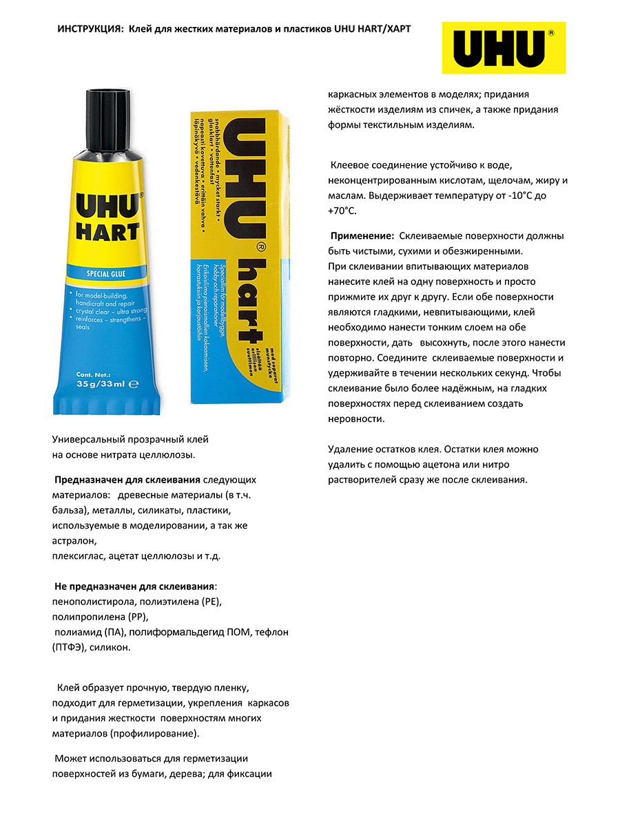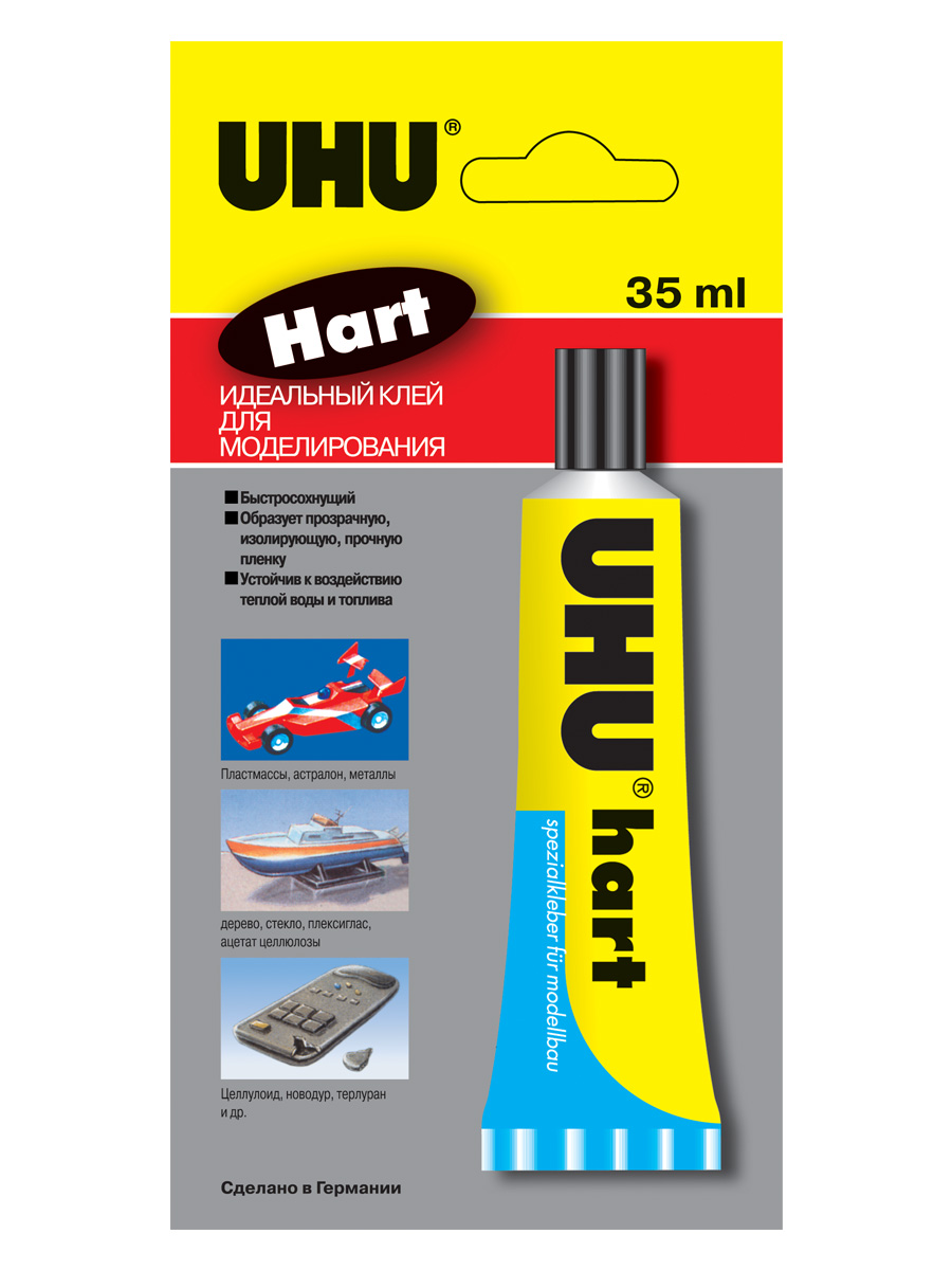 Универсальный прозрачный клей на основе нитрата целлюлозы специально разработан с учетом особенностей структуры поверхностей жестких пластиков. UHU Hard показывает хорошие результаты на дереве, древесных материалах, силикатах и пластиках, используемых в моделировании, а так же на астралоне, плексигласе, ацетате целлюлозы, целлулоиде, новодуре и терлуране. Может использоваться для герметизации поверхностей из бумаги, дерева, фиксации каркасных элементов в моделях, придания формы текстильным изделиям. Схватывает очень быстро, образуя изолирующую, абсолютно прозрачную и очень прочную клеевую пленку. Клеевое соединение устойчиво к воде, не концентрированным кислотам, щелочам, жиру и маслам. Не устойчиво к ацетону и нитрорастворителям. Выдерживает температуру от -10 С до +70 С. Уникальный продукт произведен в Германии и отвечает европейским требованиям безопасности и качества продукции.
