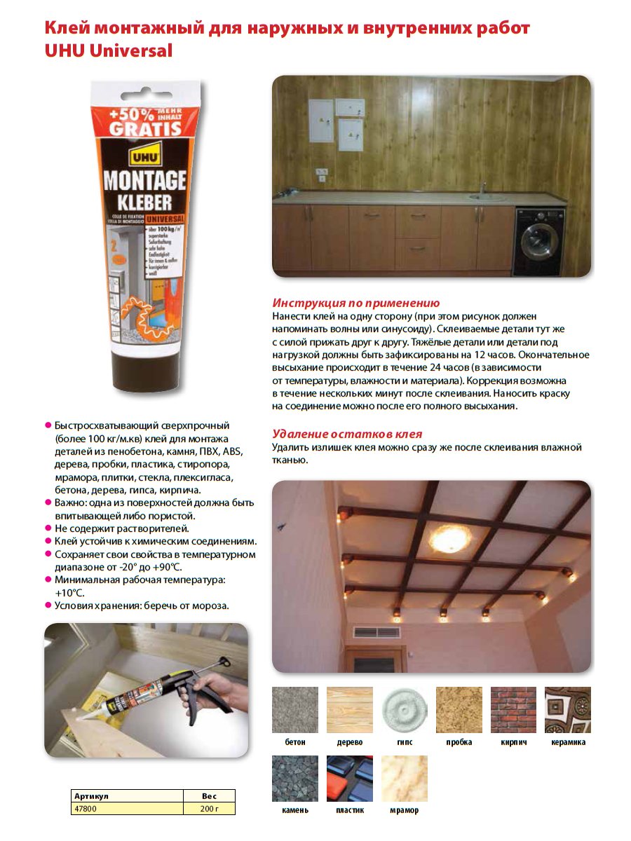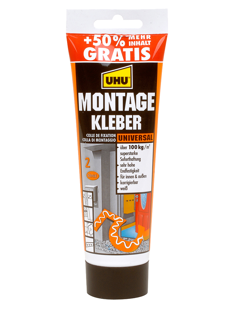 Клей монтажный для наружных и внутренних работ UHU Montage - быстросхватывающий, сверхпрочный Клей для монтажа изделий из пенобетона, камня, ПВХ, ABS, дерева, пробки, пластика, стиропора, мрамора, плитки, стекла, плексигласа, бетона, дерева, гипса, кирпича. Важно: одна из поверхностей должна быть впитывающей либо пористой. Не содержит растворителей. Клеевое соединение устойчиво к химическим веществам, выдерживает нагрузку более 100 кг. на 1 м.кв. Сохраняет свои свойства в температурном диапазоне от минус 20 С до плюс 90 С. Минимальная рабочая температура плюс 10 С. Условия хранения: беречь от мороза. Необходимо нанести Клей на одну из склеиваемых поверхностей, далее с силой прижать друг к другу. Коррекция возможна в течении нескольких минут после склеивания. Для прочности клеевого соединения тяжелые детали должны быть зафиксированы на 12 часов. Покрывать, обрабатывать клеевое соединение можно после полного его высыхания. Излишки клея рекомендуется удалить сразу после склеивания тканью.