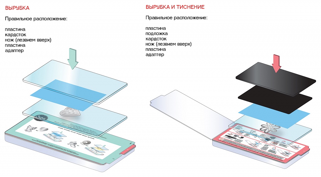 Для вырубки понадобится пара стандартных платин для вырубки и платформа, входящая в комплект машинки. Поскольку ножи тонкие, рекомендуется прокатать материал через машинку 3 раза. Для более легкого отделения вырезанного материала от ножа, перед вырубкой рекомендуется положить лист вощёной бумаги между ножом для вырубки Thinlits и материалом.