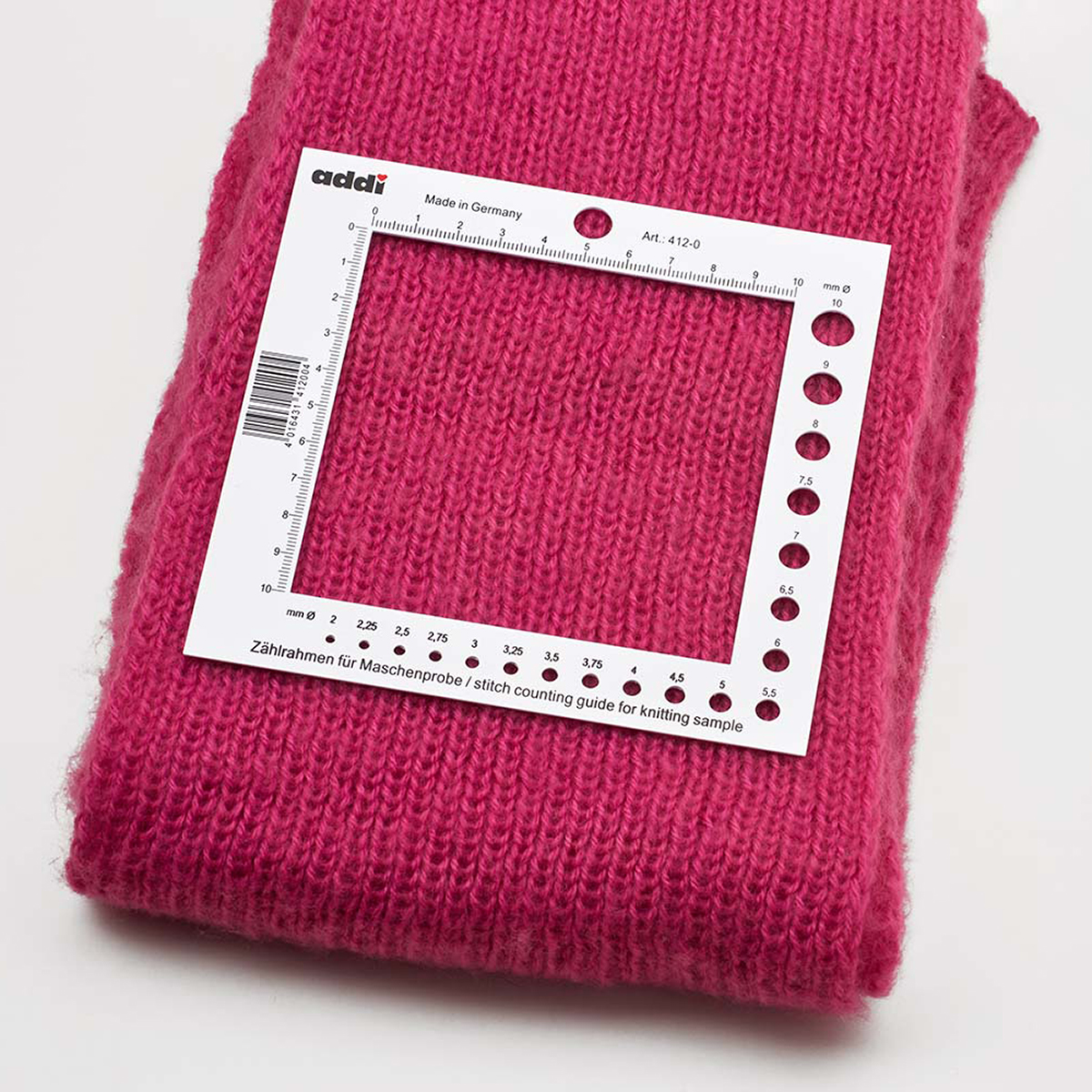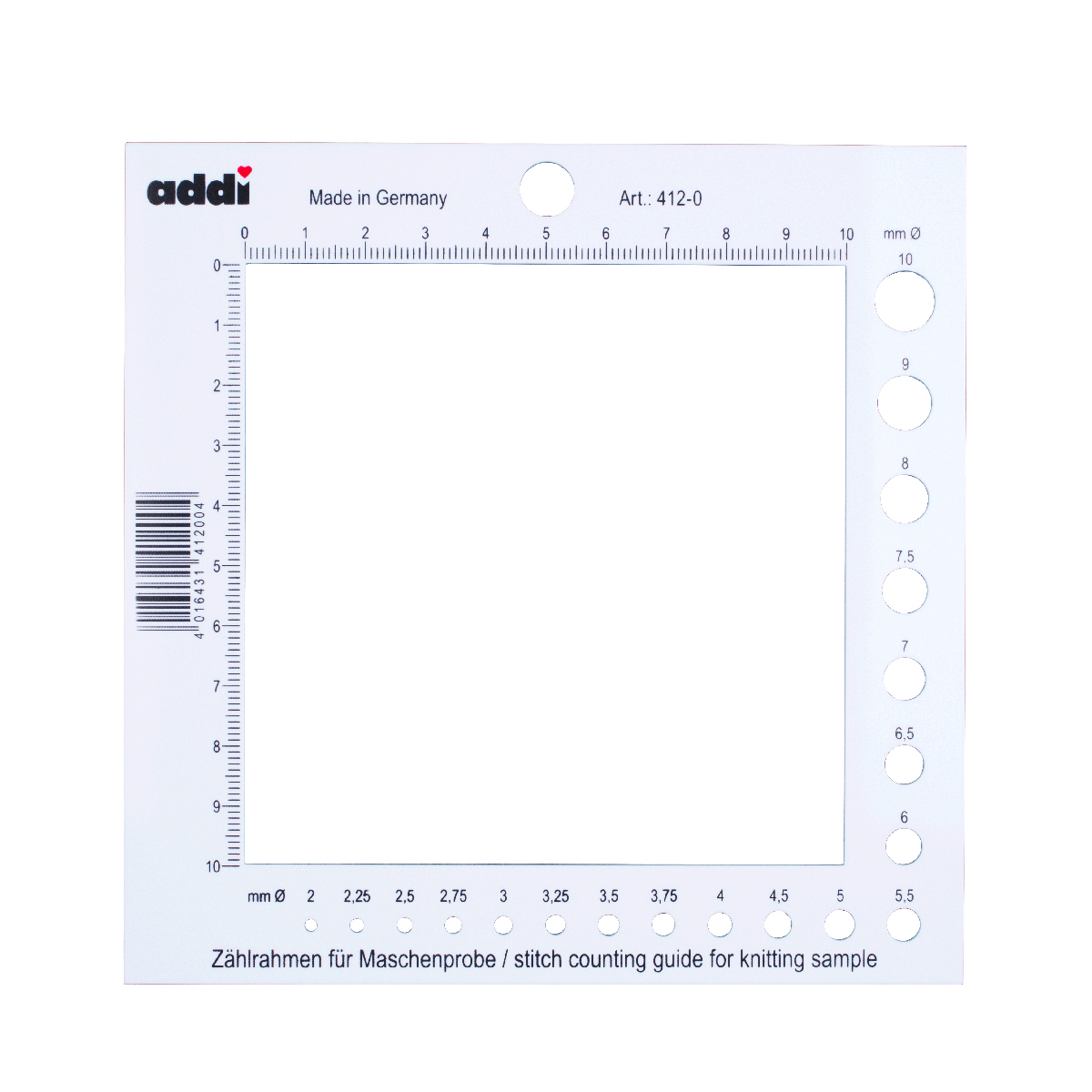 Счетная рамка для спиц торговой марки addi изготовлена из особо прочного гибкого пластика. Помогает точно рассчитать количество петель и рядов в образце. Также содержит измеритель спиц.