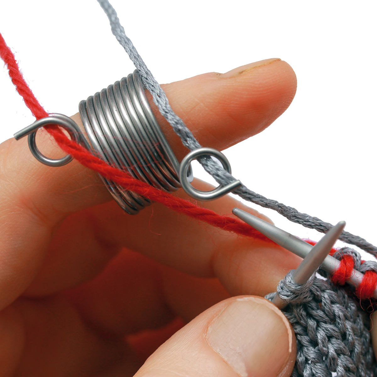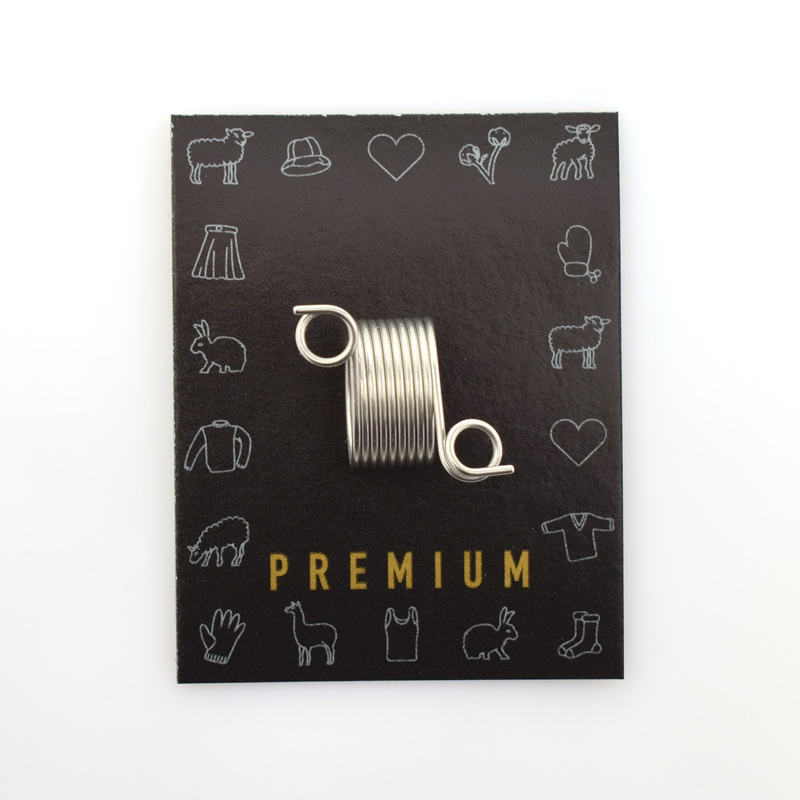 Это устройсто сделано в виде пружины из стали для удобства при вязании несколькими цветами пряжи одновременно. Он облегчает работу и направляет нити в удобном направлении