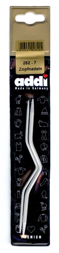 Спицы предназначены для вязания жгутов, кос и других узоров с перехватами. Они представляют собой изогнутую спицу с прогибом посередине, на котором размещаются петли, снятые для перехвата или перемещения. Эти спицы обоюдоострые, это удобно: сначала одним концом они снимаются с основной спицы, откладываются либо за работой, либо перед работой, петли при этом не соскальзывают, располагаясь в выемке спицы. И, когда нужно их провязать, они просто перемещаются к другому концу спицы, и провязываются прямо с нее, не возвращаясь на основную спицу. Это было бы необходимо сделать, если Вы использовали булавку, или обычную спицу с наконечником в качестве вспомогательной. Прекрасный и удобный инструмент от addi.