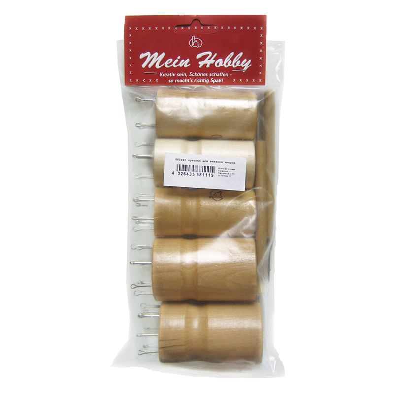 Куколки для вязания декоративных шнуров из пряжи, сутажа, ниток или проволоки с бисером,бусинами и т.д. Материал – дерево, в комплекте игла. Упаковка – прозрачный пластик с картонной верхней частью.