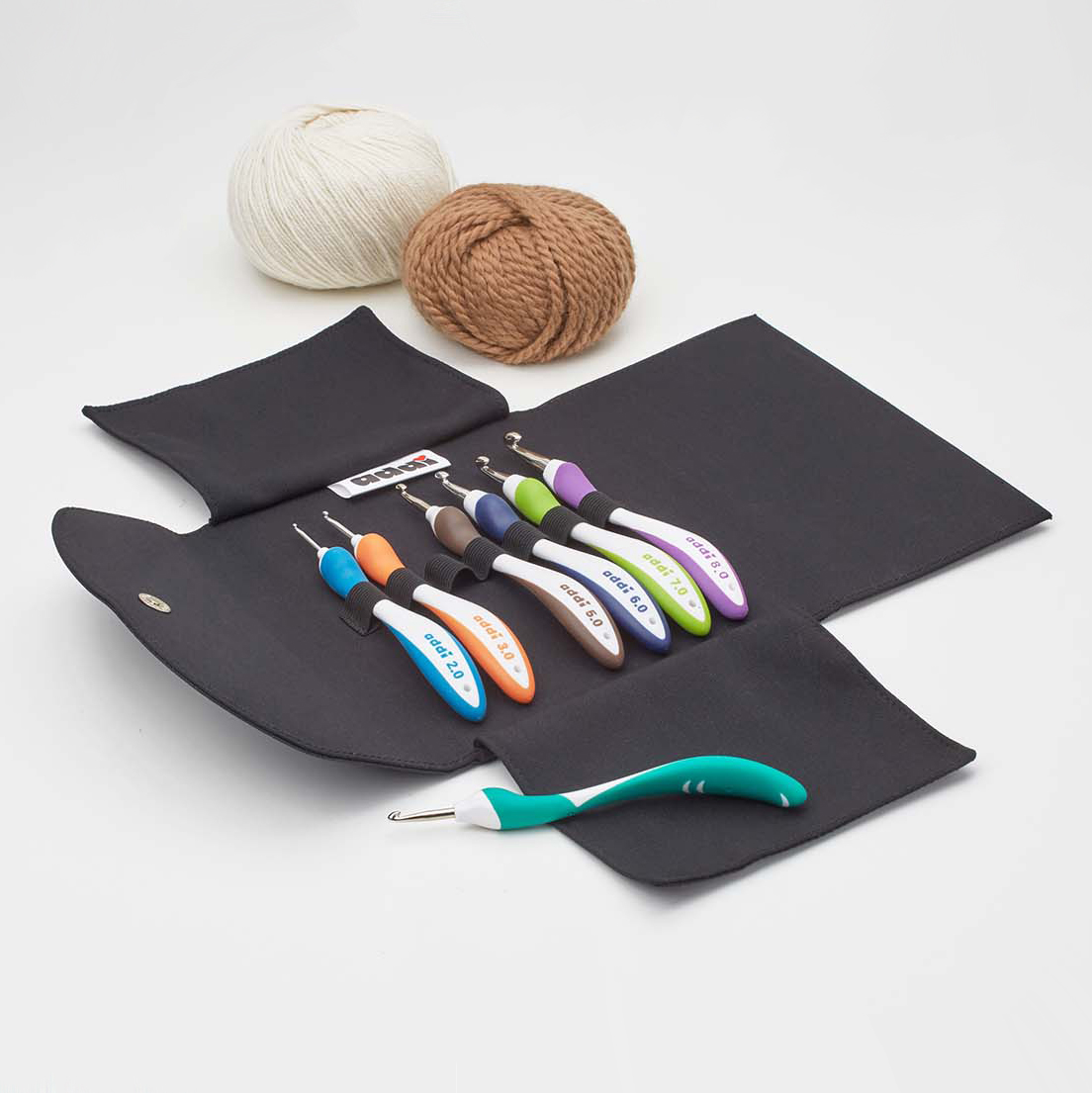 Элегантный чехол для крючков с эргономичной ручкой addiSwing выполнен из высококачественного текстиля, вмещает 7 крючков addiSwing.