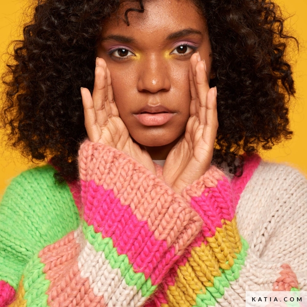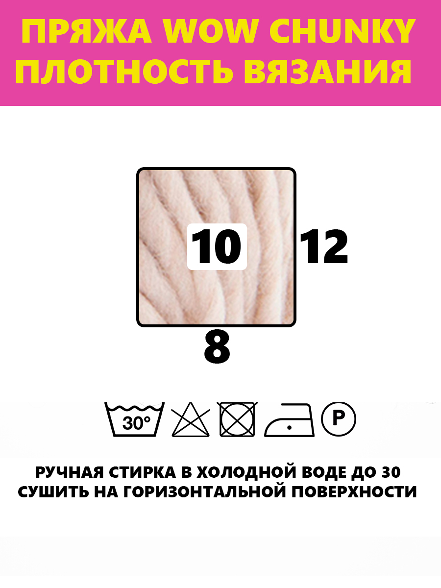 Мягкая стирка при максимальной температуре 30 С, отбеливание запрещено, не сушить в стиральной машине, максимальная температура подошвы - 110 С, только сухая чистка, толщина спиц и крючка 9 - 10 мм, на один женский свитер уходит примерно 7 мотков