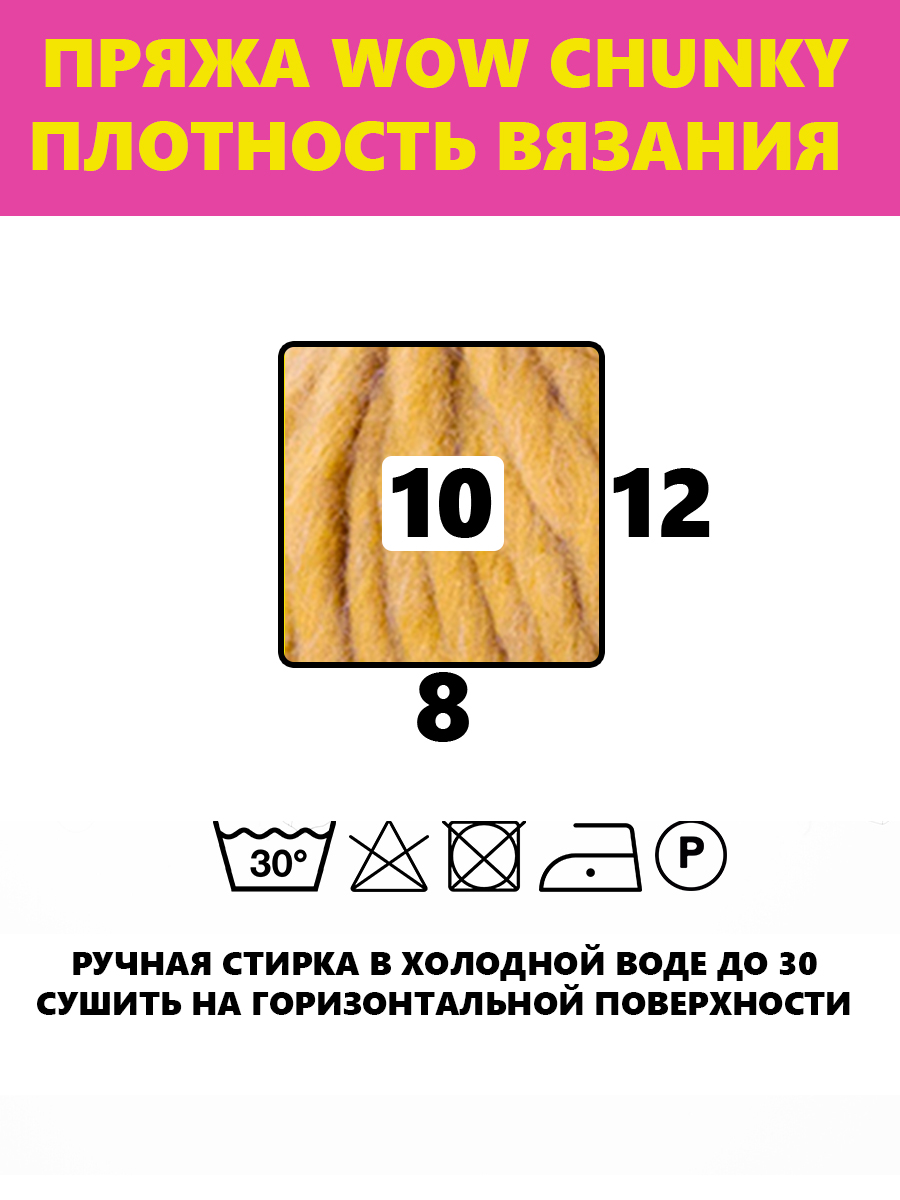Мягкая стирка при максимальной температуре 30 С, отбеливание запрещено, не сушить в стиральной машине, максимальная температура подошвы - 110 С, только сухая чистка, толщина спиц и крючка 9 - 10 мм, на один женский свитер уходит примерно 7 мотков