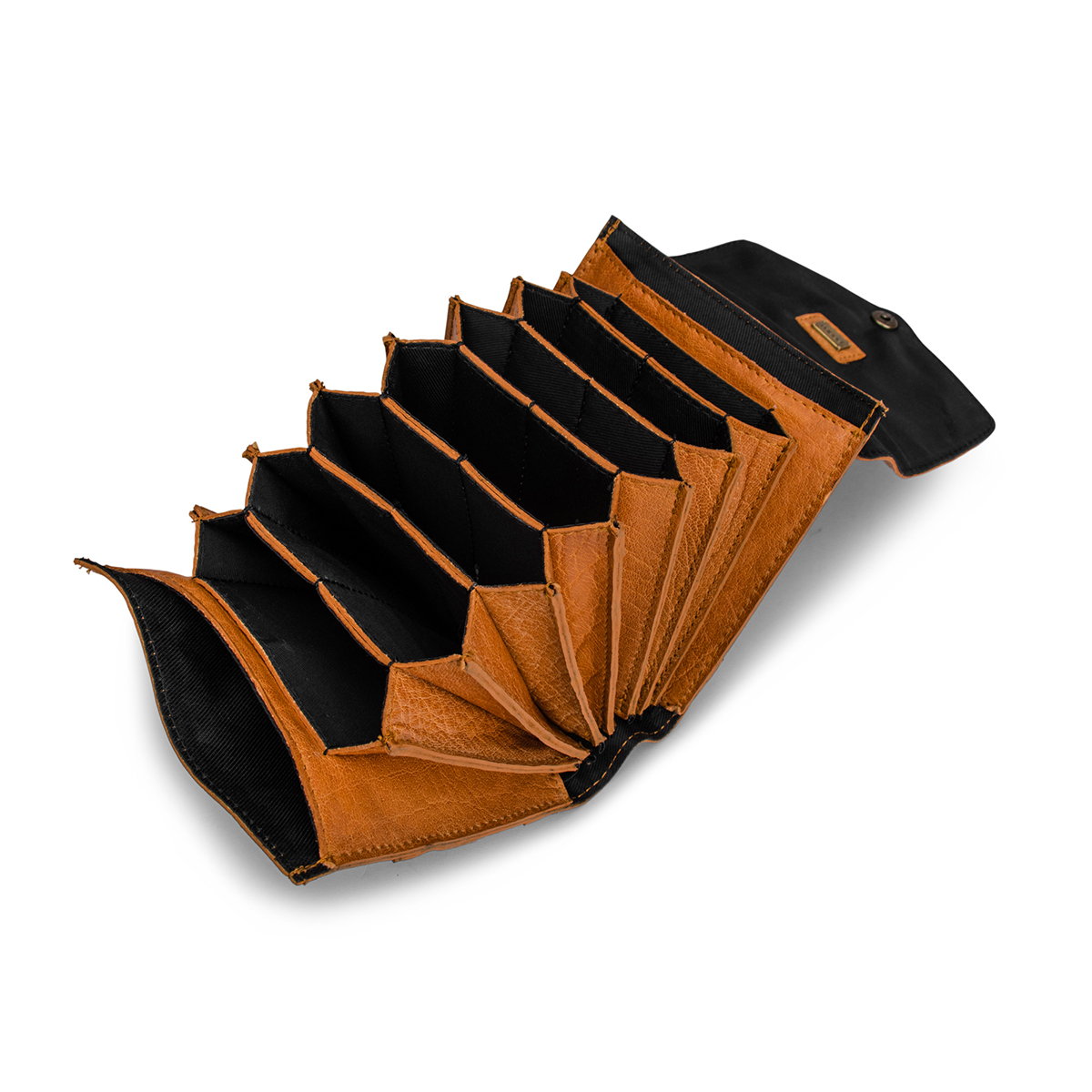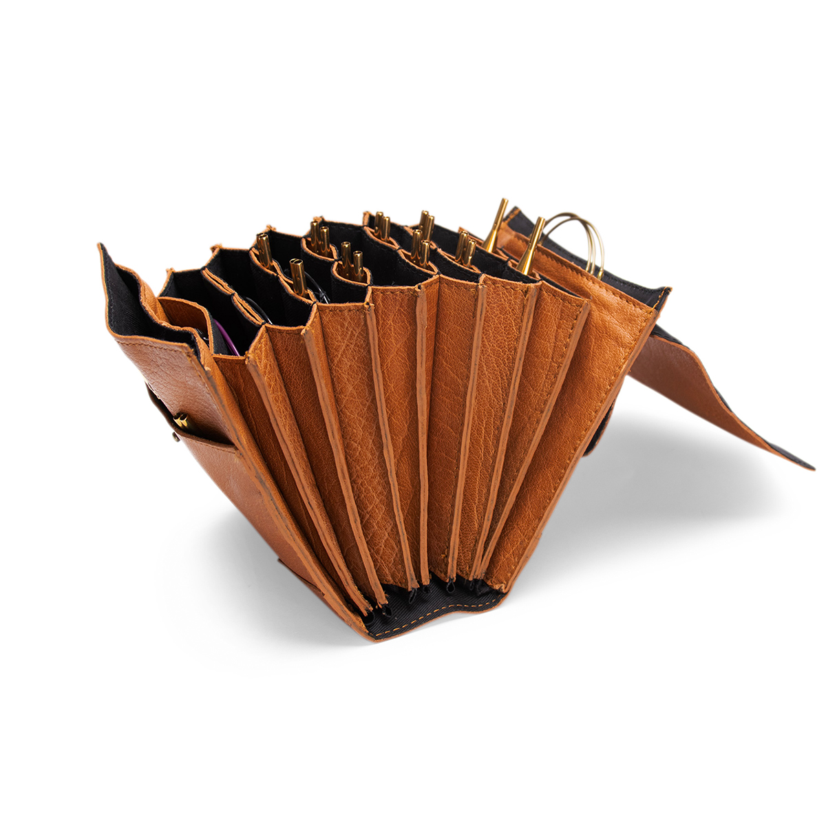 Чехол для спиц закрывается на кнопку, чтобы ваши вязальные принадлежности оставались внутри чехла, когда вы кладете его в сумку. Кнопку можно застегнуть на пуговицу двух размеров, что позволяет выбрать подходящую для вашего содержимого.