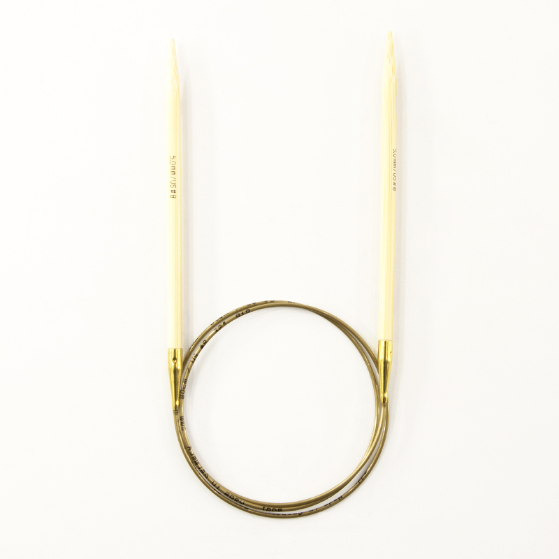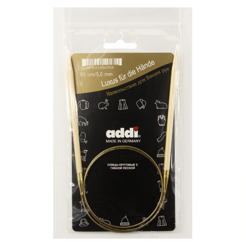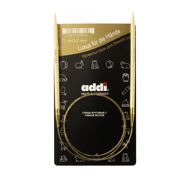Спицы из высококачественного бамбука, который растет на юге Японии, где очень холодно. Он растет очень медленно, и поэтому очень прочный. Именно такой бамбук используется для спиц addi, самый прочный из всех сортов бамбука в мире. Спицы не стучат при вязке. На знаменитой золотой леске есть все необходимая информация. Леска очень гибкая и позволяет мягко скользить спицам между петлями. Переход от спицы к леске очень деликатен. При производстве каждая спица проходит дополнительный тактильный контроль. Поверхность спицы обрабатывается специальным, высокотехнологичным японским воском, который закрывает поры бамбука и делает поверхность абсолютно гладкой. Спицы addi Bambus идеальны для людей с аллергией на металл и их едва слышно при вязании