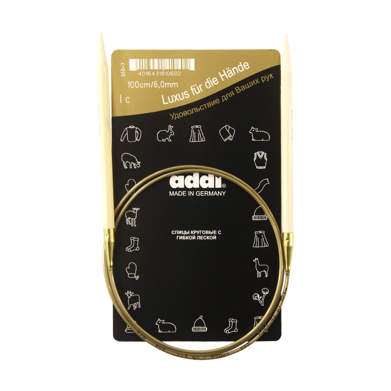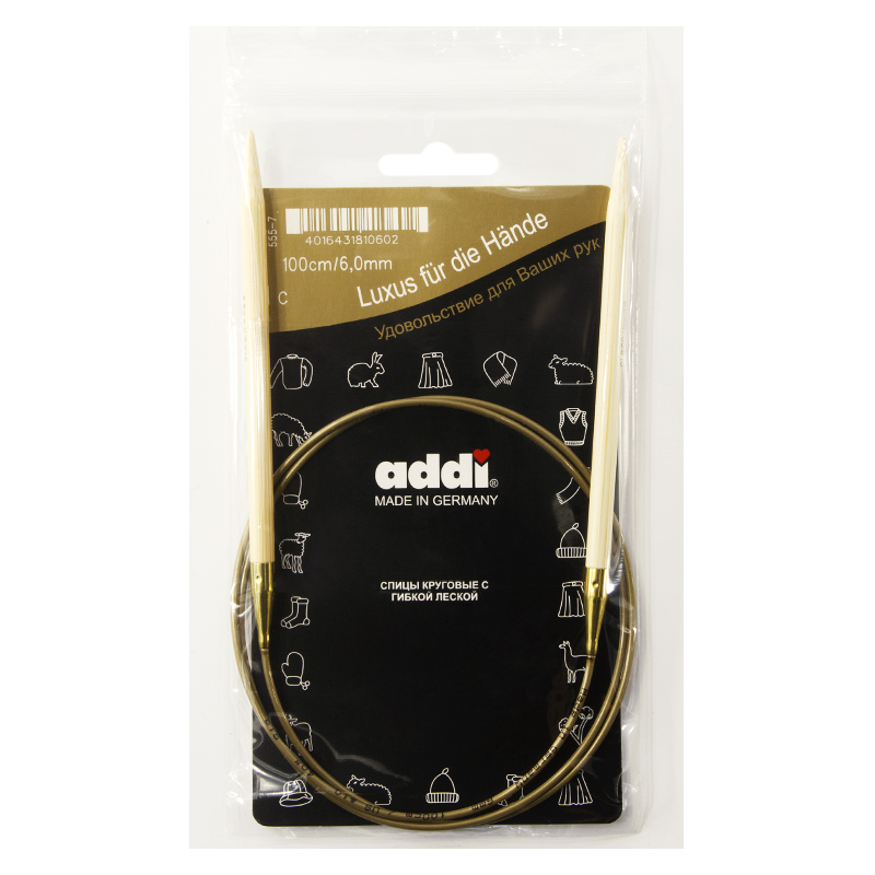 Спицы из высококачественного бамбука, который растет на юге Японии, где очень холодно. Он растет очень медленно, и поэтому очень прочный. Именно такой бамбук используется для спиц addi, самый прочный из всех сортов бамбука в мире. Спицы не стучат при вязке. На знаменитой золотой леске есть все необходимая информация. Леска очень гибкая и позволяет мягко скользить спицам между петлями. Переход от спицы к леске очень деликатен. При производстве каждая спица проходит дополнительный тактильный контроль. Поверхность спицы обрабатывается специальным, высокотехнологичным японским воском, который закрывает поры бамбука и делает поверхность абсолютно гладкой. Спицы addi Bambus идеальны для людей с аллергией на металл и их едва слышно при вязании