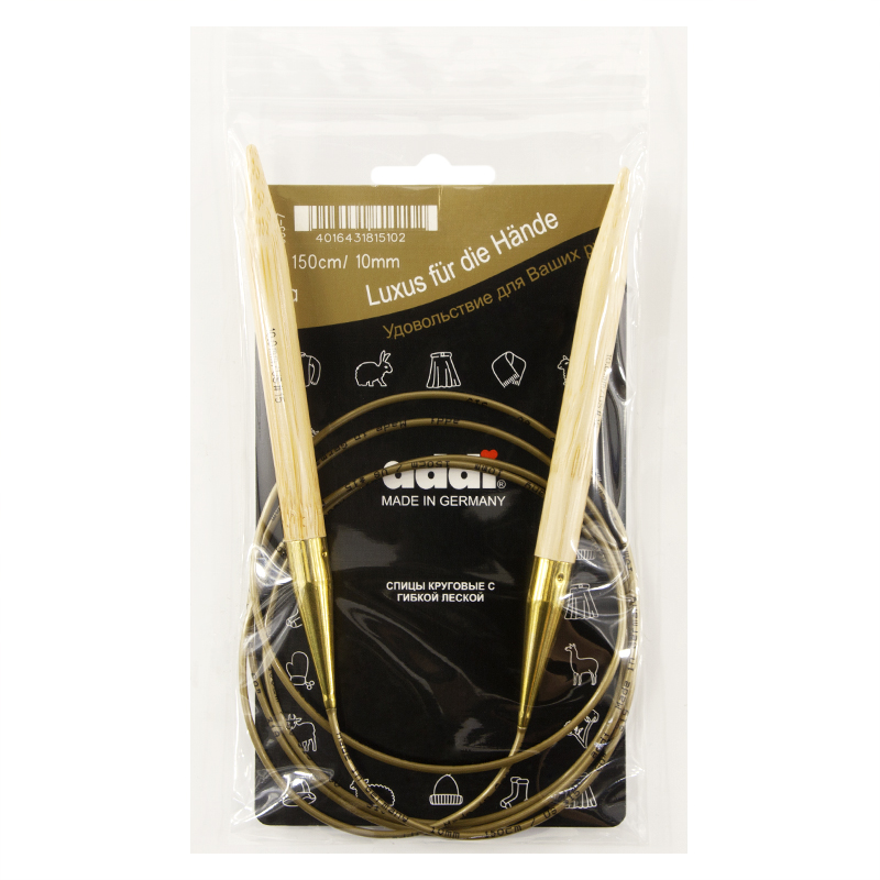 Спицы из высококачественного бамбука, который растет на юге Японии, где очень холодно. Он растет очень медленно, и поэтому очень прочный. Именно такой бамбук используется для спиц addi, самый прочный из всех сортов бамбука в мире. Спицы не стучат при вязке. На знаменитой золотой леске есть все необходимая информация. Леска очень гибкая и позволяет мягко скользить спицам между петлями. Переход от спицы к леске очень деликатен. При производстве каждая спица проходит дополнительный тактильный контроль. Поверхность спицы обрабатывается специальным, высокотехнологичным японским воском, который закрывает поры бамбука и делает поверхность абсолютно гладкой. Спицы addi Bambus идеальны для людей с аллергией на металл и их едва слышно при вязании