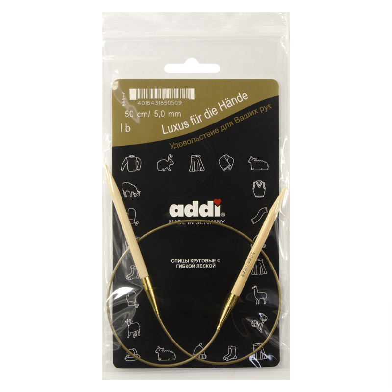 Спицы из высококачественного бамбука, который растет на юге Японии, где очень холодно. Он растет очень медленно, и поэтому очень прочный. Именно такой бамбук используется для спиц addi, самый прочный из всех сортов бамбука в мире. Спицы не стучат при вязке. На знаменитой золотой леске есть все необходимая информация. Леска очень гибкая и позволяет мягко скользить спицам между петлями. Переход от спицы к леске очень деликатен. При производстве каждая спица проходит дополнительный тактильный контроль. Поверхность спицы обрабатывается специальным, высокотехнологичным японским воском, который закрывает поры бамбука и делает поверхность абсолютно гладкой. Спицы addi Bambus идеальны для людей с аллергией на металл и их едва слышно при вязании