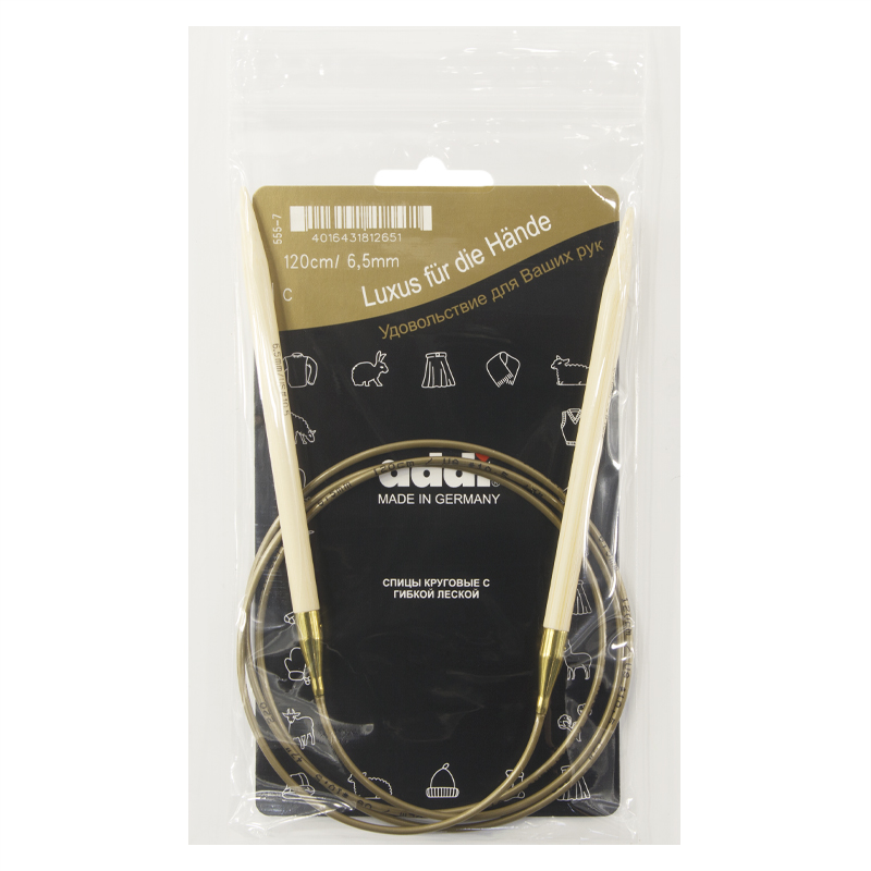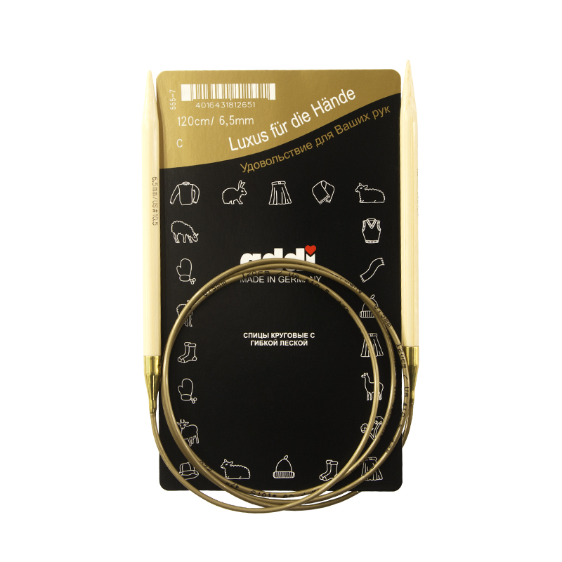 Спицы из высококачественного бамбука, который растет на юге Японии, где очень холодно. Он растет очень медленно, и поэтому очень прочный. Именно такой бамбук используется для спиц addi, самый прочный из всех сортов бамбука в мире. Спицы не стучат при вязке. На знаменитой золотой леске есть все необходимая информация. Леска очень гибкая и позволяет мягко скользить спицам между петлями. Переход от спицы к леске очень деликатен. При производстве каждая спица проходит дополнительный тактильный контроль. Поверхность спицы обрабатывается специальным, высокотехнологичным японским воском, который закрывает поры бамбука и делает поверхность абсолютно гладкой. Спицы addi Bambus идеальны для людей с аллергией на металл и их едва слышно при вязании