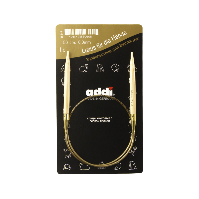 Спицы из высококачественного бамбука, который растет на юге Японии, где очень холодно. Он растет очень медленно, и поэтому очень прочный. Именно такой бамбук используется для спиц addi, самый прочный из всех сортов бамбука в мире. Спицы не стучат при вязке. На знаменитой золотой леске есть все необходимая информация. Леска очень гибкая и позволяет мягко скользить спицам между петлями. Переход от спицы к леске очень деликатен. При производстве каждая спица проходит дополнительный тактильный контроль. Поверхность спицы обрабатывается специальным, высокотехнологичным японским воском, который закрывает поры бамбука и делает поверхность абсолютно гладкой. Спицы addi Bambus идеальны для людей с аллергией на металл и их едва слышно при вязании
