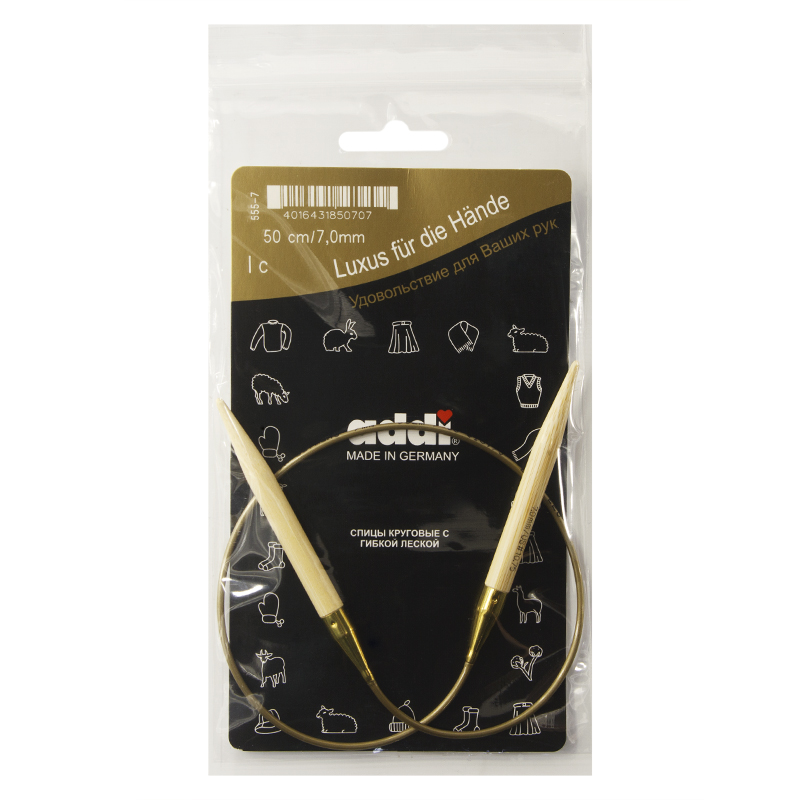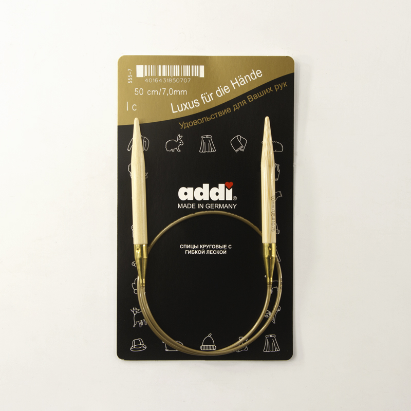 Спицы из высококачественного бамбука, который растет на юге Японии, где очень холодно. Он растет очень медленно, и поэтому очень прочный. Именно такой бамбук используется для спиц addi, самый прочный из всех сортов бамбука в мире. Спицы не стучат при вязке. На знаменитой золотой леске есть все необходимая информация. Леска очень гибкая и позволяет мягко скользить спицам между петлями. Переход от спицы к леске очень деликатен. При производстве каждая спица проходит дополнительный тактильный контроль. Поверхность спицы обрабатывается специальным, высокотехнологичным японским воском, который закрывает поры бамбука и делает поверхность абсолютно гладкой. Спицы addi Bambus идеальны для людей с аллергией на металл и их едва слышно при вязании