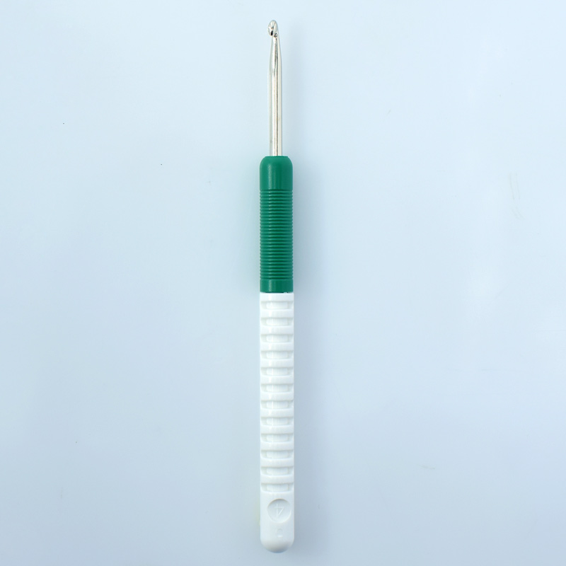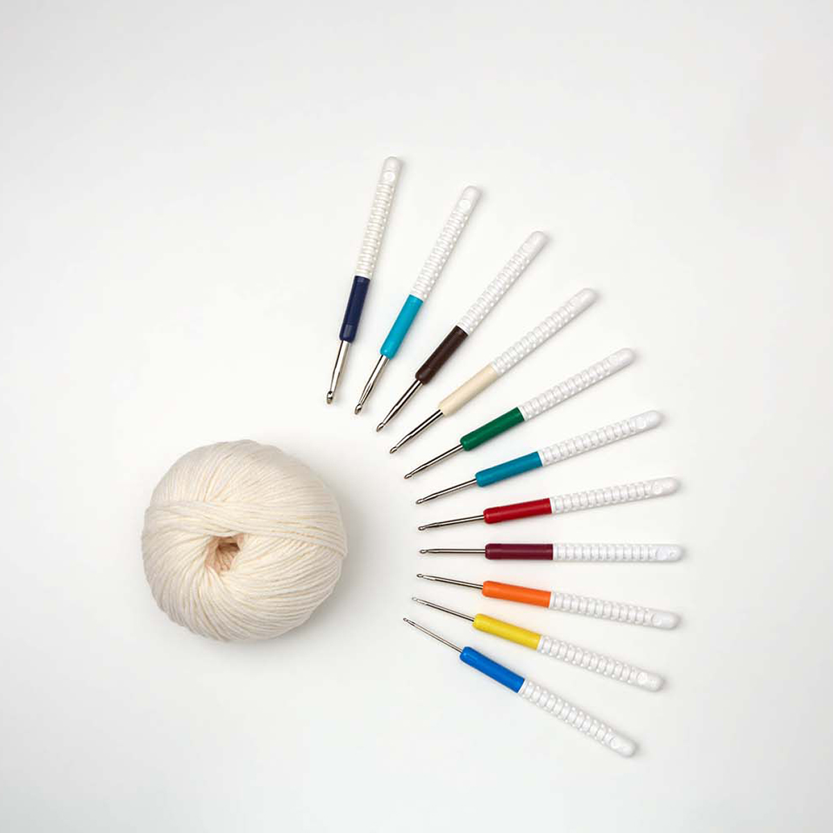 Это классика. Цвет ручки означает толщину крючка – очень удобно для потребителей. Номер крючка нанесен на поверхность прессом и остается на вечно. Усиленная и удлиненная ручка расслабляет руку. Так как многие любят вязать летом, была разработана специальная рифленая ручка. При вязании рука меньше потеет, так как воздух проникает в щели между крючком и ладонью, кожа руки лучше дышит. Артикул 148-7 идеально подходит для различных крючковых техник вязания. Размеры от 2 мм до 6 мм, выполненные из высококачественного пластика. Для детей или начинающих эти крючки идеальны из-за своей невысокой стоимости.