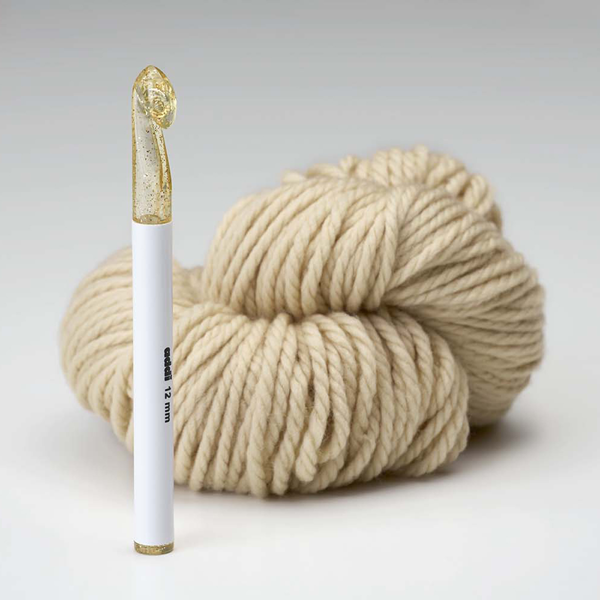 Пластиковые крючки addi сделаны из высококачественной пластмассы. Они гладкие и легкие, а в толщинах от 12 мм производитель делает полую ручку для легкости вязания. Крючек толщиною 20 мм имеет удлиненную ручку для более удобной работы. В работе крючок просто замечательный. Одним только своим видом уже радует глаз. Отлит он из прозрачного пластика с добавлением крупненьких золотистых частиц. Крючки №12, №15 и №20 отлиты из двух продольных половинок. Рукоятка с крючком образуют монолит. Можно не волноваться по поводу того, что рукоятка оторвётся или будет проворачиваться. Обработан и отполирован крючок прекрасно. Нет торчащих выступов, заусенцев пластика. Гладенькая поверхность крючка позволяет ему виртуозно скользить внутрь петель и обратно. Из руки, при вязании, не выскальзывает, хотя и гладкий. Благодаря материалу из которого он изготовлен, крючок оказывается очень лёгким, почти невесомым. Кисть не устаёт от долгого орудования таким крючком. И буквально за один - два вечера, при наличии свободного времени, можно связать целый коврик-половичок. Хорошее качество краски, которой нанесена фирменная надпись и размер крючка в миллиметрах. Во-первых, она контрастная цвету самого крючка и хорошо видна на нём. Во-вторых, очень стойкая. Даже после интенсивных часов и нескольких дней непрерывного вязания краска и не думает стираться. Упаковка крючка выполнена из мягкой полипропиленовой плёнки. С одной стороны - строгий черный цвет, а с другой - прозрачная с рисуночками. Крючок хорошо виден на чёрном фоне через прозрачную плёнку. У потребителя, в этом случае, есть возможность оценить качество инструмента перед покупкой, не доставая его из упаковки.