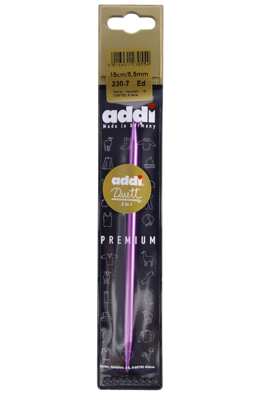 Цветные крючки с поверхностью из анодированного алюминия addiDuett имеют практичное тонкое острие на конце. При помощи этой дополнительной функции можно набирать петли и сразу их провязывать. Также с их помощью можно поднять спущенные петли и сразу их провязать. С острием на конце и нитью на крючке можно в вязание продеть страховочную нить.