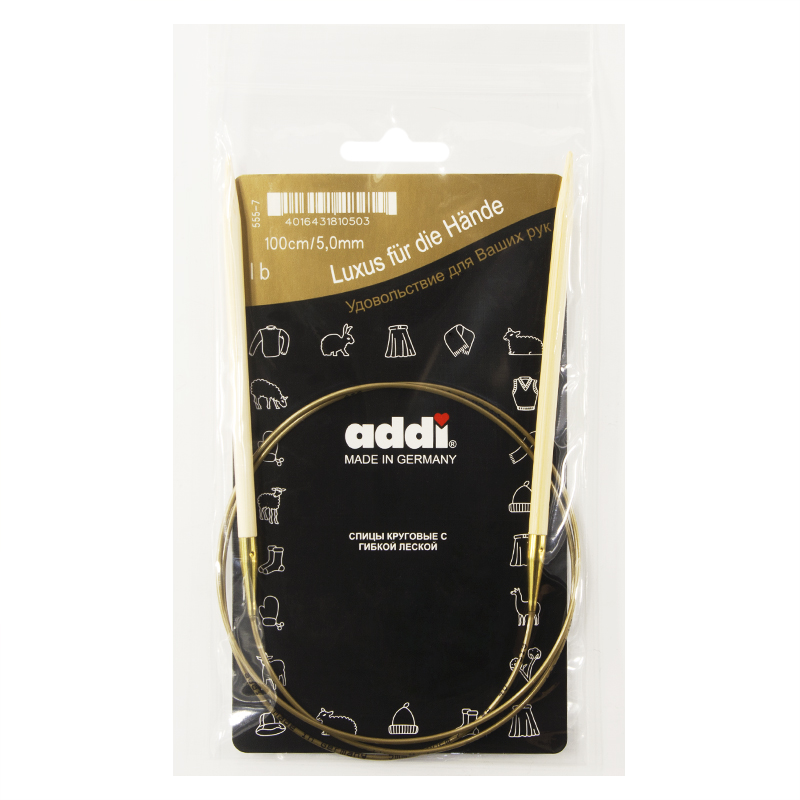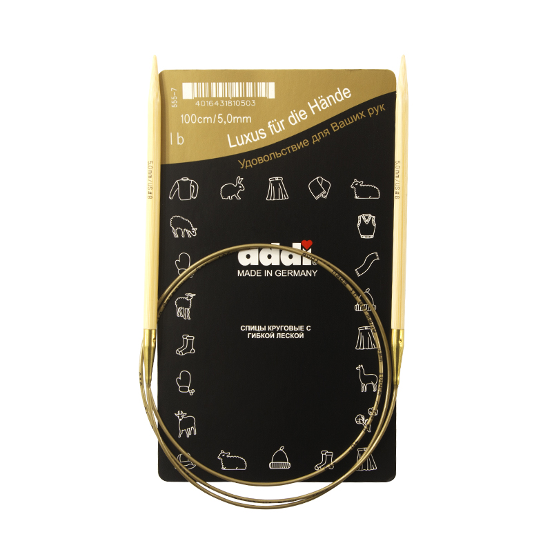 Спицы из высококачественного бамбука, который растет на юге Японии, где очень холодно. Он растет очень медленно, и поэтому очень прочный. Именно такой бамбук используется для спиц addi, самый прочный из всех сортов бамбука в мире. Спицы не стучат при вязке. На знаменитой золотой леске есть все необходимая информация. Леска очень гибкая и позволяет мягко скользить спицам между петлями. Переход от спицы к леске очень деликатен. При производстве каждая спица проходит дополнительный тактильный контроль. Поверхность спицы обрабатывается специальным, высокотехнологичным японским воском, который закрывает поры бамбука и делает поверхность абсолютно гладкой. Спицы addi Bambus идеальны для людей с аллергией на металл и их едва слышно при вязании