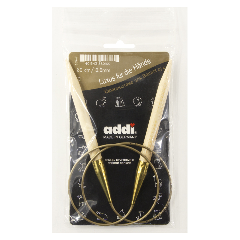Спицы из высококачественного бамбука, который растет на юге Японии, где очень холодно. Он растет очень медленно, и поэтому очень прочный. Именно такой бамбук используется для спиц addi, самый прочный из всех сортов бамбука в мире. Спицы не стучат при вязке. На знаменитой золотой леске есть все необходимая информация. Леска очень гибкая и позволяет мягко скользить спицам между петлями. Переход от спицы к леске очень деликатен. При производстве каждая спица проходит дополнительный тактильный контроль. Поверхность спицы обрабатывается специальным, высокотехнологичным японским воском, который закрывает поры бамбука и делает поверхность абсолютно гладкой. Спицы addi Bambus идеальны для людей с аллергией на металл и их едва слышно при вязании