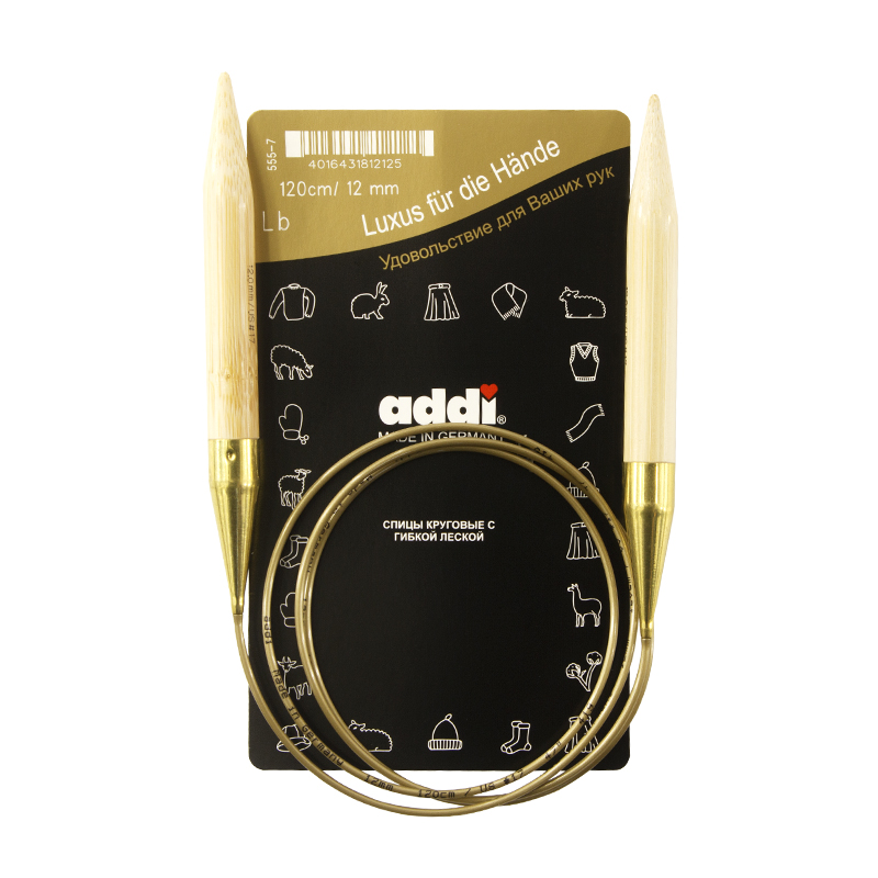Спицы из высококачественного бамбука, который растет на юге Японии, где очень холодно. Он растет очень медленно, и поэтому очень прочный. Именно такой бамбук используется для спиц addi, самый прочный из всех сортов бамбука в мире. Спицы не стучат при вязке. На знаменитой золотой леске есть все необходимая информация. Леска очень гибкая и позволяет мягко скользить спицам между петлями. Переход от спицы к леске очень деликатен. При производстве каждая спица проходит дополнительный тактильный контроль. Поверхность спицы обрабатывается специальным, высокотехнологичным японским воском, который закрывает поры бамбука и делает поверхность абсолютно гладкой. Спицы addi Bambus идеальны для людей с аллергией на металл и их едва слышно при вязании