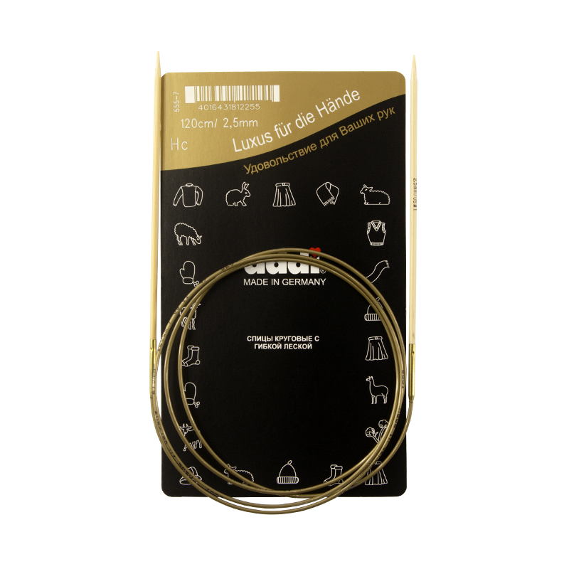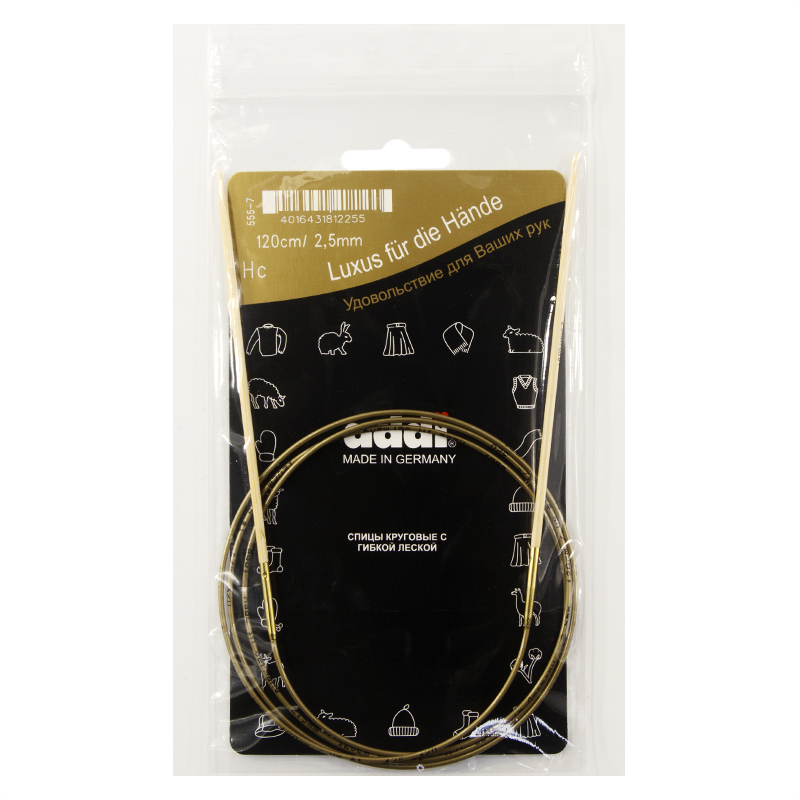 Спицы из высококачественного бамбука, который растет на юге Японии, где очень холодно. Он растет очень медленно, и поэтому очень прочный. Именно такой бамбук используется для спиц addi, самый прочный из всех сортов бамбука в мире. Спицы не стучат при вязке. На знаменитой золотой леске есть все необходимая информация. Леска очень гибкая и позволяет мягко скользить спицам между петлями. Переход от спицы к леске очень деликатен. При производстве каждая спица проходит дополнительный тактильный контроль. Поверхность спицы обрабатывается специальным, высокотехнологичным японским воском, который закрывает поры бамбука и делает поверхность абсолютно гладкой. Спицы addi Bambus идеальны для людей с аллергией на металл и их едва слышно при вязании
