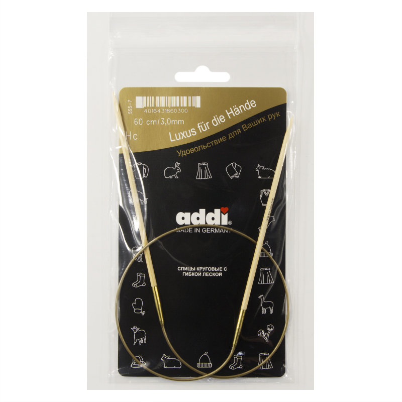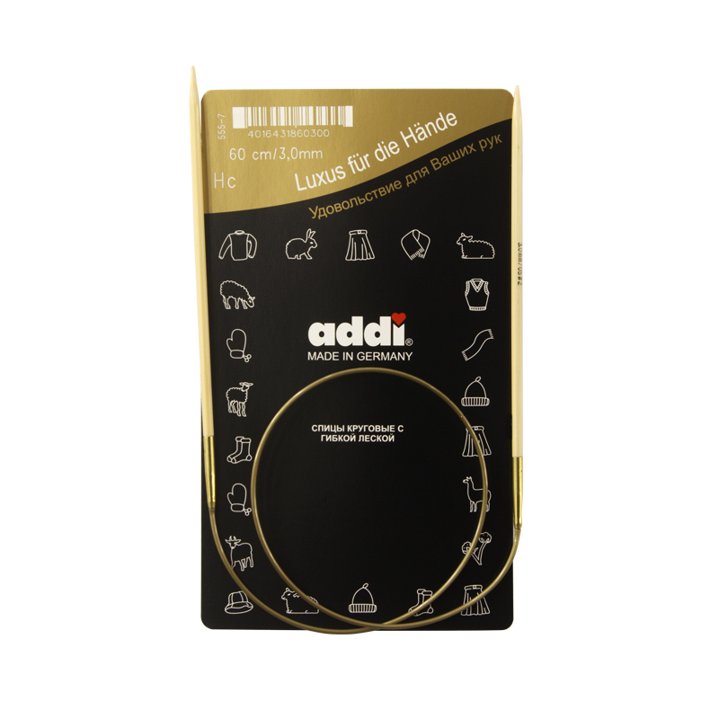 Спицы из высококачественного бамбука, который растет на юге Японии, где очень холодно. Он растет очень медленно, и поэтому очень прочный. Именно такой бамбук используется для спиц addi, самый прочный из всех сортов бамбука в мире. Спицы не стучат при вязке. На знаменитой золотой леске есть все необходимая информация. Леска очень гибкая и позволяет мягко скользить спицам между петлями. Переход от спицы к леске очень деликатен. При производстве каждая спица проходит дополнительный тактильный контроль. Поверхность спицы обрабатывается специальным, высокотехнологичным японским воском, который закрывает поры бамбука и делает поверхность абсолютно гладкой. Спицы addi Bambus идеальны для людей с аллергией на металл и их едва слышно при вязании