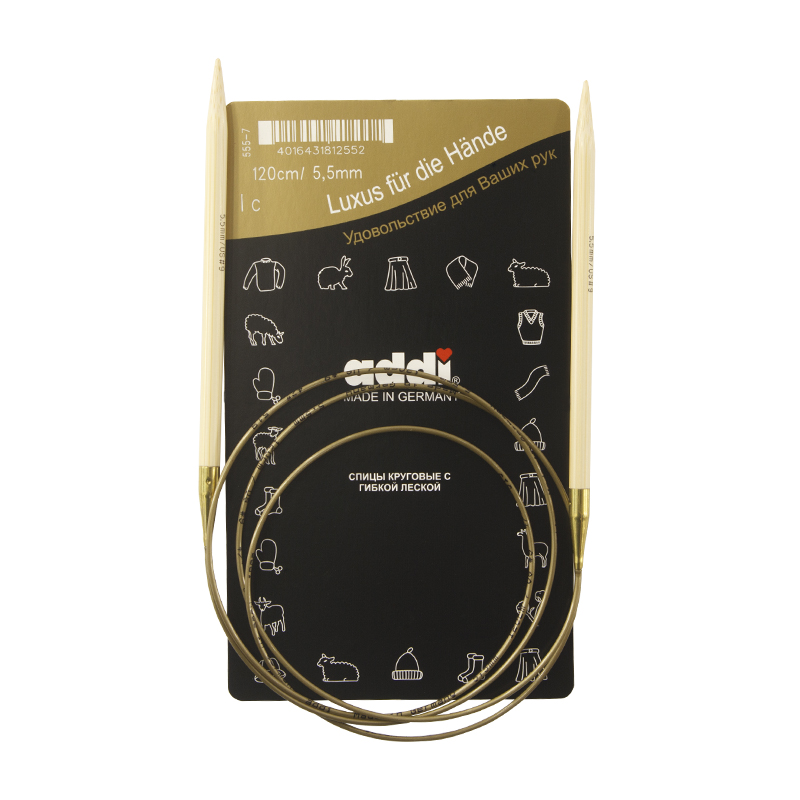 Спицы из высококачественного бамбука, который растет на юге Японии, где очень холодно. Он растет очень медленно, и поэтому очень прочный. Именно такой бамбук используется для спиц addi, самый прочный из всех сортов бамбука в мире. Спицы не стучат при вязке. На знаменитой золотой леске есть все необходимая информация. Леска очень гибкая и позволяет мягко скользить спицам между петлями. Переход от спицы к леске очень деликатен. При производстве каждая спица проходит дополнительный тактильный контроль. Поверхность спицы обрабатывается специальным, высокотехнологичным японским воском, который закрывает поры бамбука и делает поверхность абсолютно гладкой. Спицы addi Bambus идеальны для людей с аллергией на металл и их едва слышно при вязании