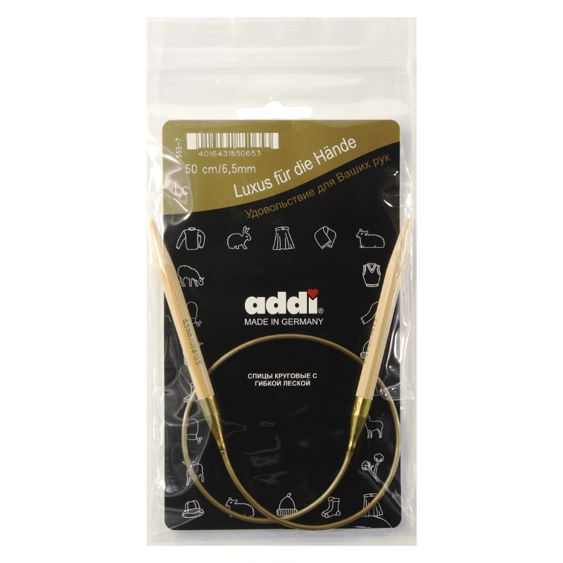 Спицы из высококачественного бамбука, который растет на юге Японии, где очень холодно. Он растет очень медленно, и поэтому очень прочный. Именно такой бамбук используется для спиц addi, самый прочный из всех сортов бамбука в мире. Спицы не стучат при вязке. На знаменитой золотой леске есть все необходимая информация. Леска очень гибкая и позволяет мягко скользить спицам между петлями. Переход от спицы к леске очень деликатен. При производстве каждая спица проходит дополнительный тактильный контроль. Поверхность спицы обрабатывается специальным, высокотехнологичным японским воском, который закрывает поры бамбука и делает поверхность абсолютно гладкой. Спицы addi Bambus идеальны для людей с аллергией на металл и их едва слышно при вязании
