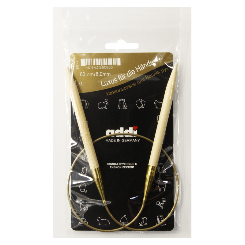 Спицы из высококачественного бамбука, который растет на юге Японии, где очень холодно. Он растет очень медленно, и поэтому очень прочный. Именно такой бамбук используется для спиц addi, самый прочный из всех сортов бамбука в мире. Спицы не стучат при вязке. На знаменитой золотой леске есть все необходимая информация. Леска очень гибкая и позволяет мягко скользить спицам между петлями. Переход от спицы к леске очень деликатен. При производстве каждая спица проходит дополнительный тактильный контроль. Поверхность спицы обрабатывается специальным, высокотехнологичным японским воском, который закрывает поры бамбука и делает поверхность абсолютно гладкой. Спицы addi Bambus идеальны для людей с аллергией на металл и их едва слышно при вязании