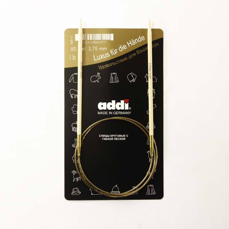 Спицы из высококачественного бамбука, который растет на юге Японии, где очень холодно. Он растет очень медленно, и поэтому очень прочный. Именно такой бамбук используется для спиц addi, самый прочный из всех сортов бамбука в мире. Спицы не стучат при вязке. На знаменитой золотой леске есть все необходимая информация. Леска очень гибкая и позволяет мягко скользить спицам между петлями. Переход от спицы к леске очень деликатен. При производстве каждая спица проходит дополнительный тактильный контроль. Поверхность спицы обрабатывается специальным, высокотехнологичным японским воском, который закрывает поры бамбука и делает поверхность абсолютно гладкой. Спицы addi Bambus идеальны для людей с аллергией на металл и их едва слышно при вязании