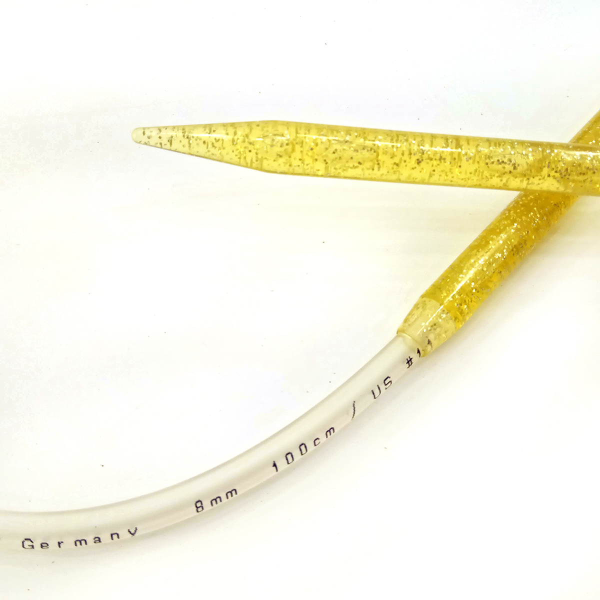 Пластиковые спицы из высококачественного сырья с золотыми блестками в виде шампанского. Улучшенная поверхность, которая дает дополнительное скольжение пряжи при вязании. Кончики спиц закругленные. Спицы скреплены гибким и прочным пластиковым шнуром. Особенность этих спиц заключается в том, что при больших толщинах типа №20 и №25 пластик дает необходимую для рук легкость.