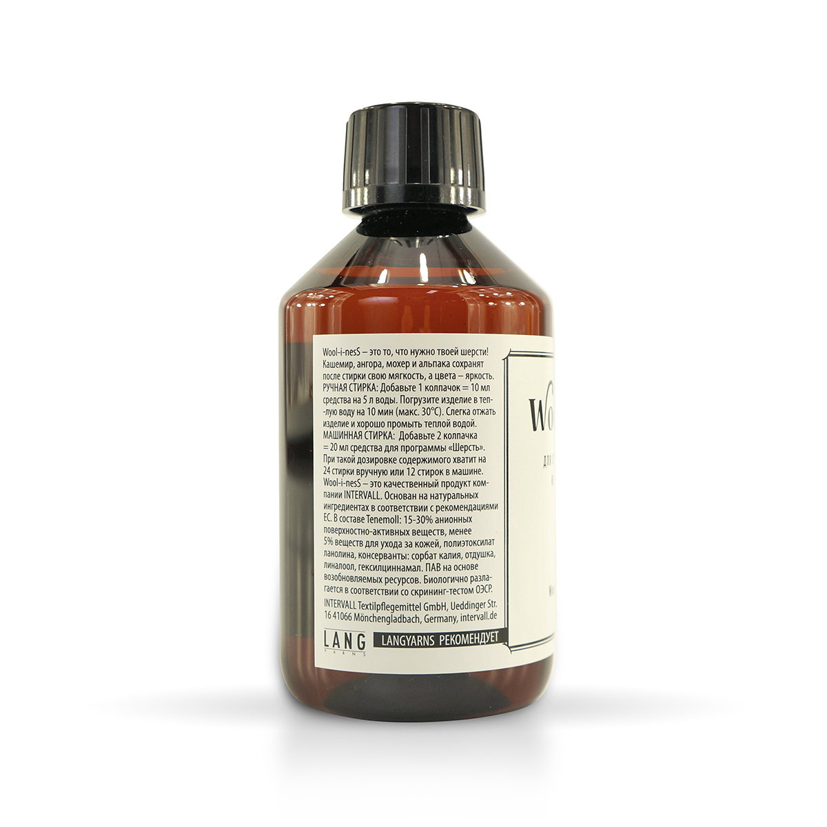 Деликатные изделия из шерсти всегда следует стирать только вручную. Дозировка при средней жесткости воды следующая: РУЧНАЯ СТИРКА: Добавьте 1 ст. ложку = 10 мл средства на 5 л воды. Погрузите изделие в теплую воду на 10 мин (макс. 30°C). Далее следует слегка отжать изделие и хорошо промыть теплой водой. При стирке изделие не трите. Для достижения оптимальных результатов сушите только в сушильной машине (добавьте теннисные мячи). МАШИННАЯ СТИРКА: Добавьте 2 ст. ложки = 20 мл средства для программы «Шерсть». При такой дозировке содержимого хватит на 48 стирок вручную или 24 стирки в машине. ПЯТНА: Нанесите несколько капель на вещи перед стиркой. Подождите 10 минут, затем промойте. После стирки положите одежду на полотенце по форме и сверните. Разверните через полчаса и просушите. Не сушите на обогревателе или солнце. Светлые и яркие шерстяные вещи стирайте отдельно. Набивные шерстяные изделия или изделия, сочетающие насыщенные цвета с белым, следует постоянно взбалтывать при стирке. Если в растворе изделие начинает линять, немедленно замените раствор. Шерстяные изделия с меткой «Superwash» можно стирать в машине (макс. 30°C) без отжима и без сушки! Wool-i-nesS – это счастье для вашей пряжи! Wool-i-nesS основан на натуральных ингредиентах. ВНИМАНИЕ. Храните в недоступном для детей месте. Может вызвать серьезное раздражение глаз. При попадании в глаза осторожно промойте водой в течение нескольких минут. Снимите контактные линзы (если они есть, и это легко сделать) и продолжайте промывать. Если раздражение глаз не проходит, обратитесь к врачу. ПРИ ПРОГЛАТЫВАНИИ и плохом самочувствии позвоните в токсикологический центр.