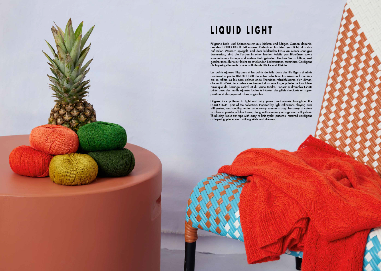 В коллекции Liquid Light преобладают ажурные кружевные узоры из легкой и воздушной пряжи. Вдохновленная игрой света на прохладой воде в солнечный летний день, цветовая палитра включает в себя широкий спектр синих оттенков, а также летний оранжевый и нежно-желтый.