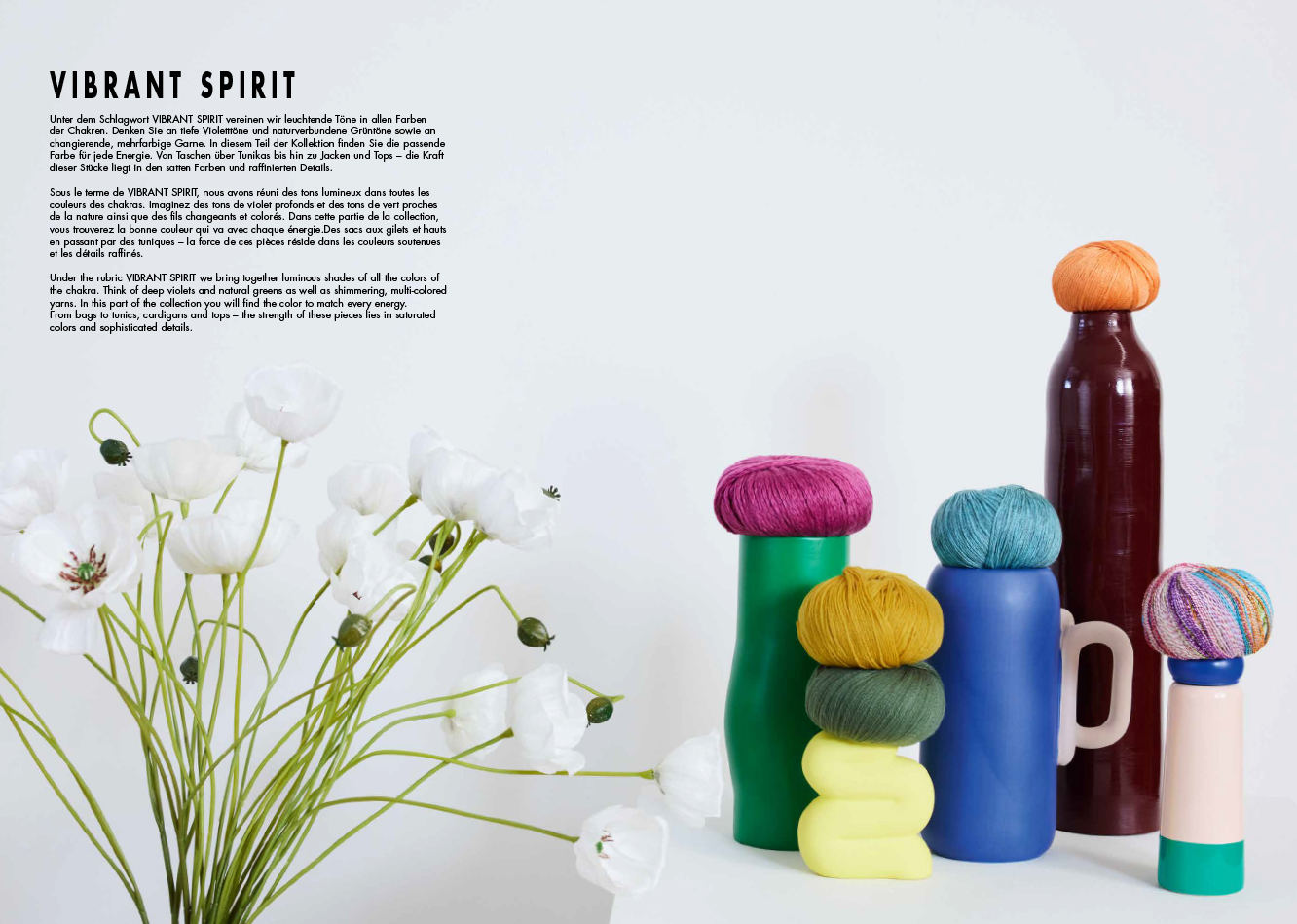 В рубрике Vibrant Spirit мы объединяем сияющие оттенки всех цветов. Представьте себе глубокие фиолетовые и натуральные зеленые тона, а также мерцающую, многоцветную пряжу. В этой части коллекции вы найдете цвет, соответствующий каждой энергии.