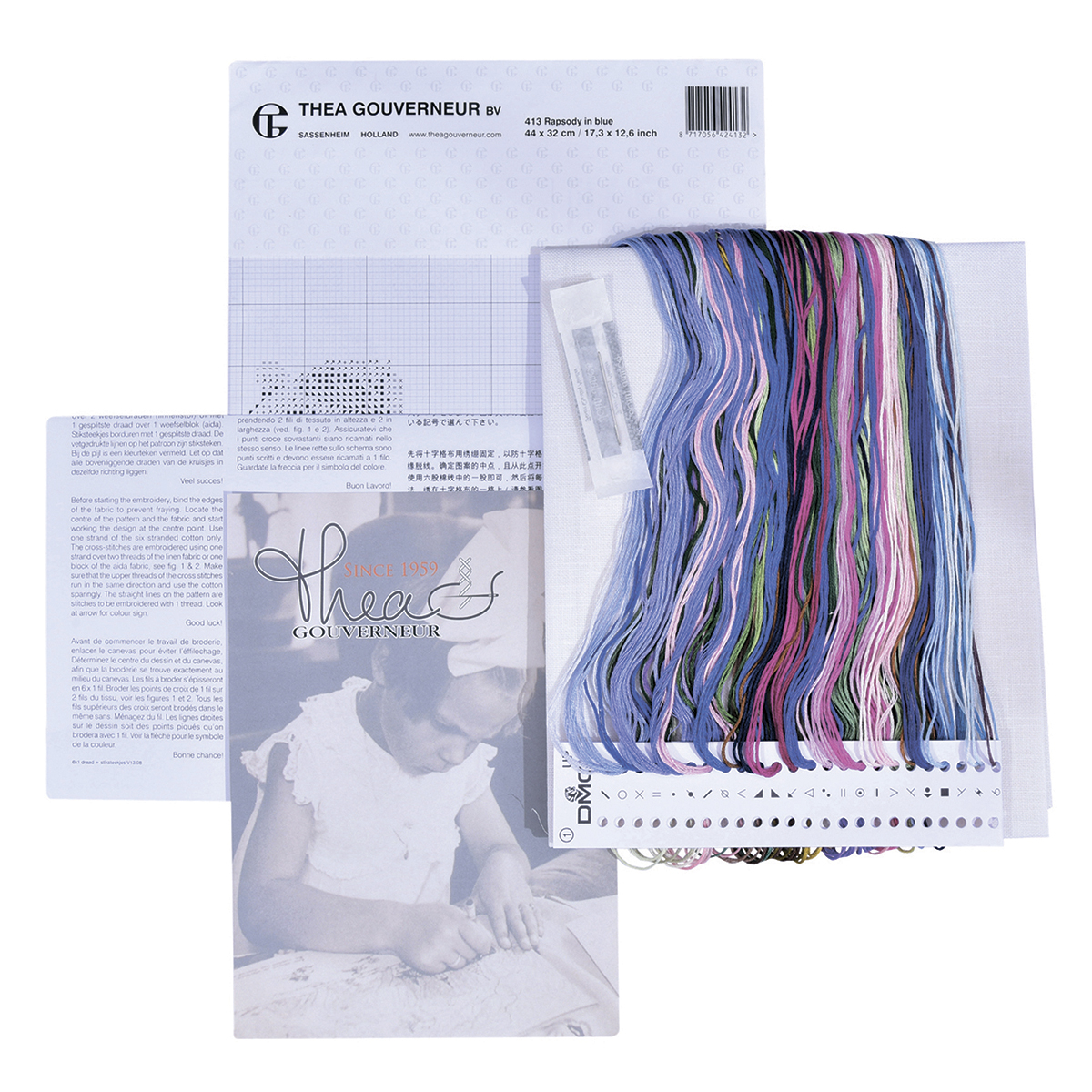 Наборы Thea Gouverneur укомплектованы качественными материалами, такими как мулине DMC из 100% хлопка и разные виды тканей для вышивания производства Zweigart. Наборы обозначенные буквой А после номера содержат в составе канву Aida, если в артикуле есть обозначение .05 – то этот набор укомплектован канвой Aida чёрного цвета. Также в ассортименте есть наборы на 100% льне и канве Jobelan. Черно-белые схемы тщательно прорабатываются вручную. Используется богатая цветовая палитра ниток, но в ассортименте компании есть и монохромные дизайны. Нитки разобраны по символам и закреплены на органайзере. Стрелка на бумажном органайзере указывает вверх, определяя правильность чтения символов.