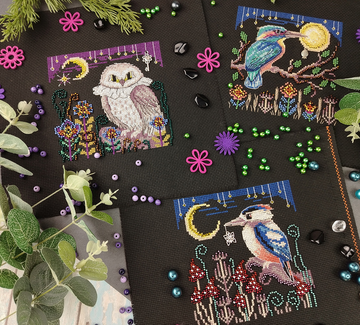 Серию объединяют размер, основа Аида 14ct, частичная вышивка бисером и декоративные пришивные элементы. Мулине Finca не разобраны на планшетки, а связаны узелком. Схема и инструкция черно-белая. Электронная схема XSD, QR код в наборе, указание о наличие схемы - знак на обложке.