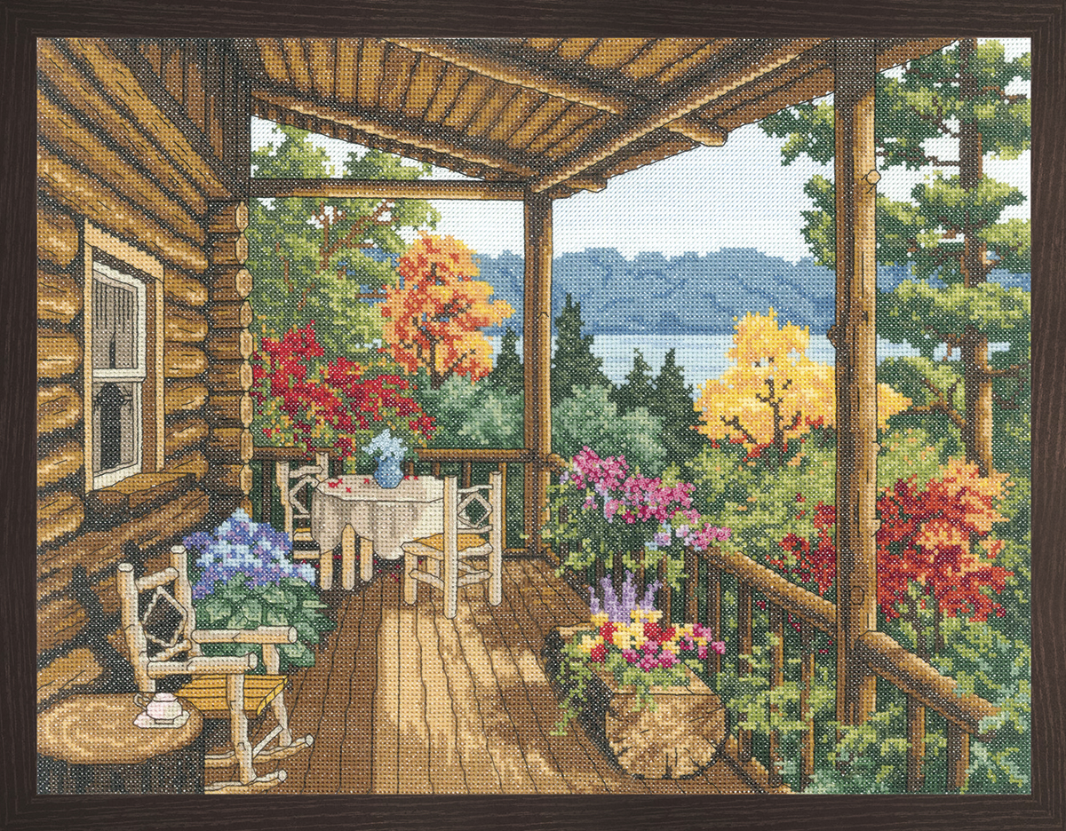 Поднимите стул и насладитесь невероятным осенним видом с крытого крыльца нашего бревенчатого коттеджа, спроектированного Сун Кимом.