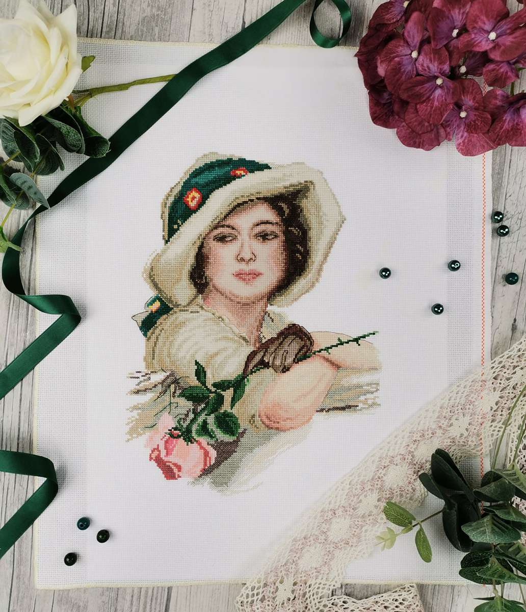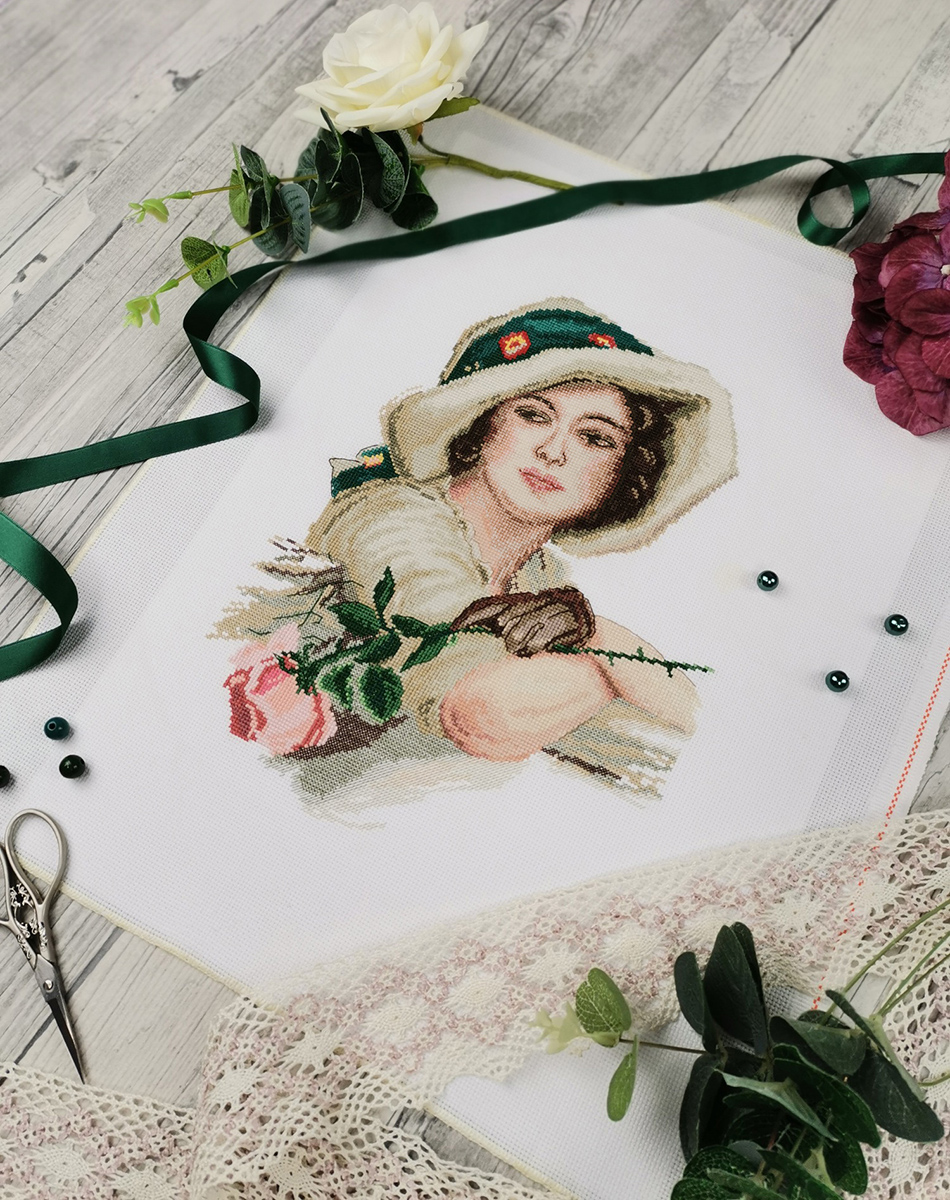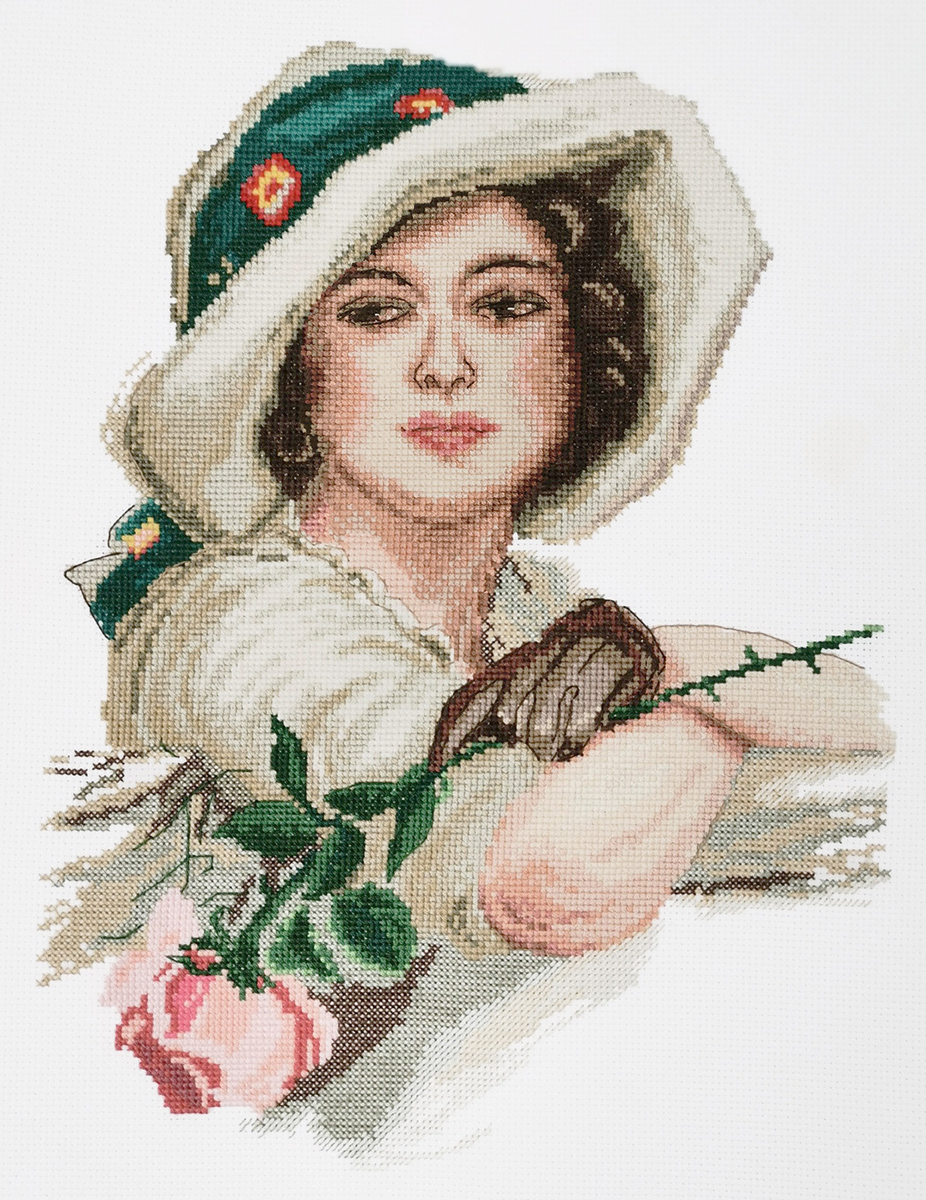 Вдохновением к разработке дизайна послужила винтажная открытка с работой Харрисона Фишера. Еще одна красавица модерновой эпохи в стильной шляпе и, конечно с розой - роскошная и утонченная представительница начала 20 века.