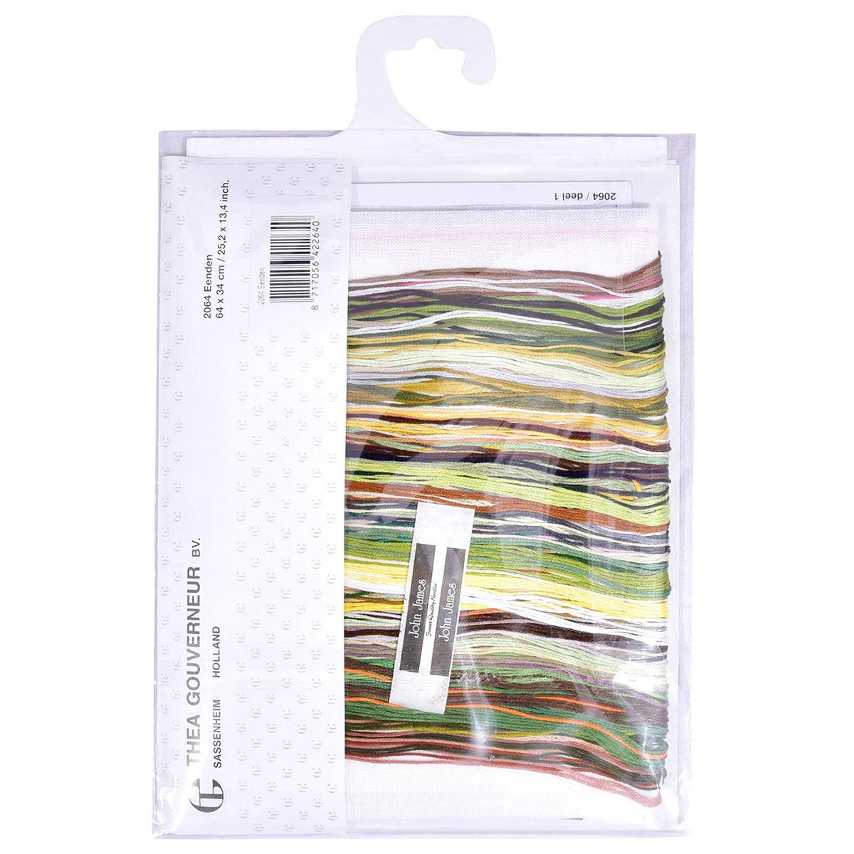 Наборы Thea Gouverneur укомплектованы качественными материалами, такими как мулине DMC из 100% хлопка и разные виды тканей для вышивания производства Zweigart. Наборы обозначенные буквой А после номера содержат в составе канву Aida, если в артикуле есть обозначение .05 – то этот набор укомплектован канвой Aida чёрного цвета. Также в ассортименте есть наборы на 100% льне и канве Jobelan. Черно-белые схемы тщательно прорабатываются вручную. Используется богатая цветовая палитра ниток, но в ассортименте компании есть и монохромные дизайны. Нитки разобраны по символам и закреплены на органайзере. Стрелка на бумажном органайзере указывает вверх, определяя правильность чтения символов.