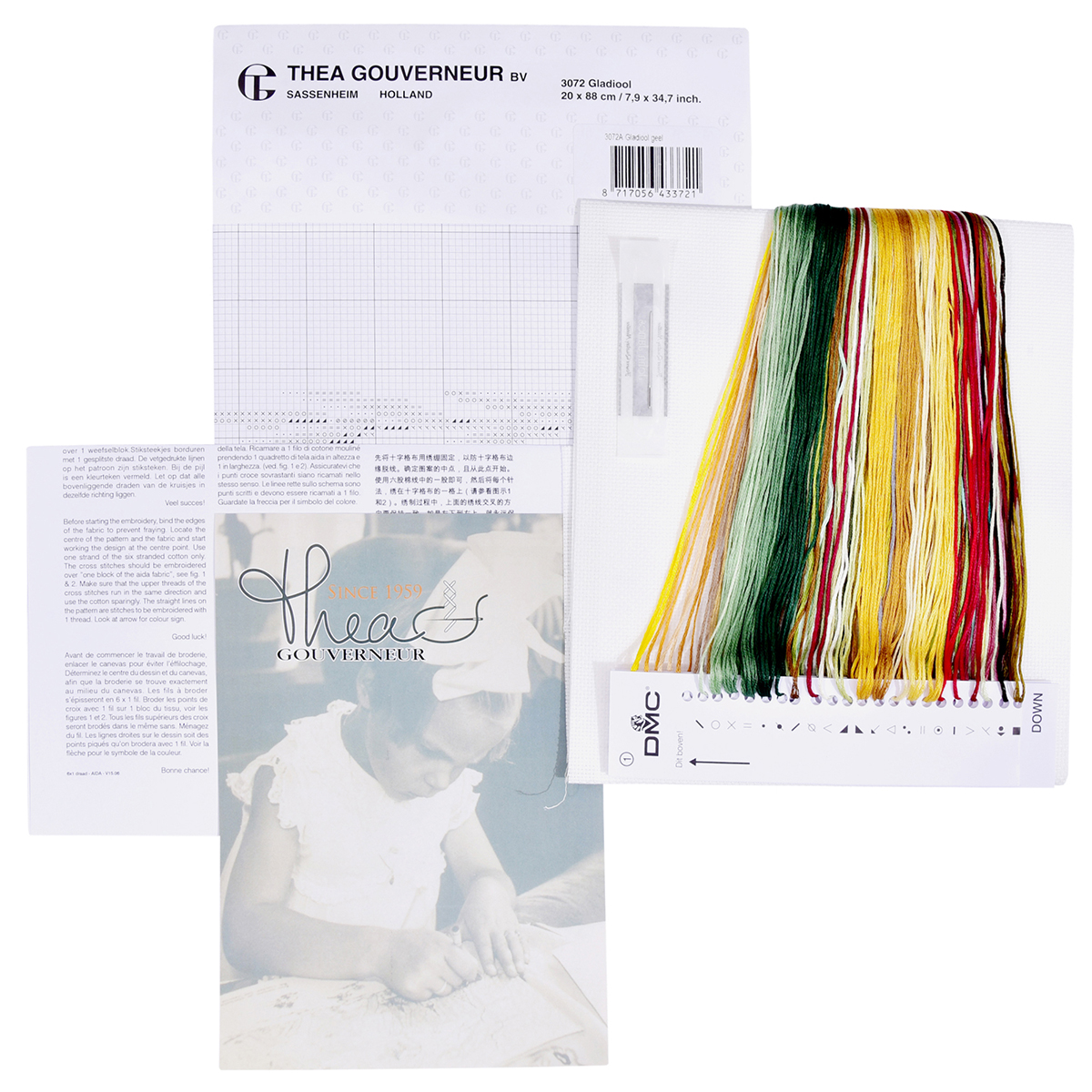 Наборы Thea Gouverneur укомплектованы качественными материалами, такими как мулине DMC из 100% хлопка и разные виды тканей для вышивания производства Zweigart. Наборы обозначенные буквой А после номера содержат в составе канву Aida, если в артикуле есть обозначение .05 – то этот набор укомплектован канвой Aida чёрного цвета. Также в ассортименте есть наборы на 100% льне и канве Jobelan. Черно-белые схемы тщательно прорабатываются вручную. Используется богатая цветовая палитра ниток, но в ассортименте компании есть и монохромные дизайны. Нитки разобраны по символам и закреплены на органайзере. Стрелка на бумажном органайзере указывает вверх, определяя правильность чтения символов.