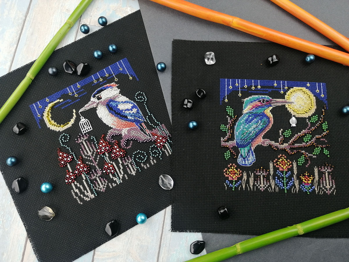 Серию объединяют размер, основа Аида 14ct, частичная вышивка бисером и декоративные пришивные элементы. Мулине Finca не разобраны на планшетки, а связаны узелком. Схема и инструкция черно-белая. Электронная схема XSD, QR код в наборе, указание о наличие схемы - знак на обложке.