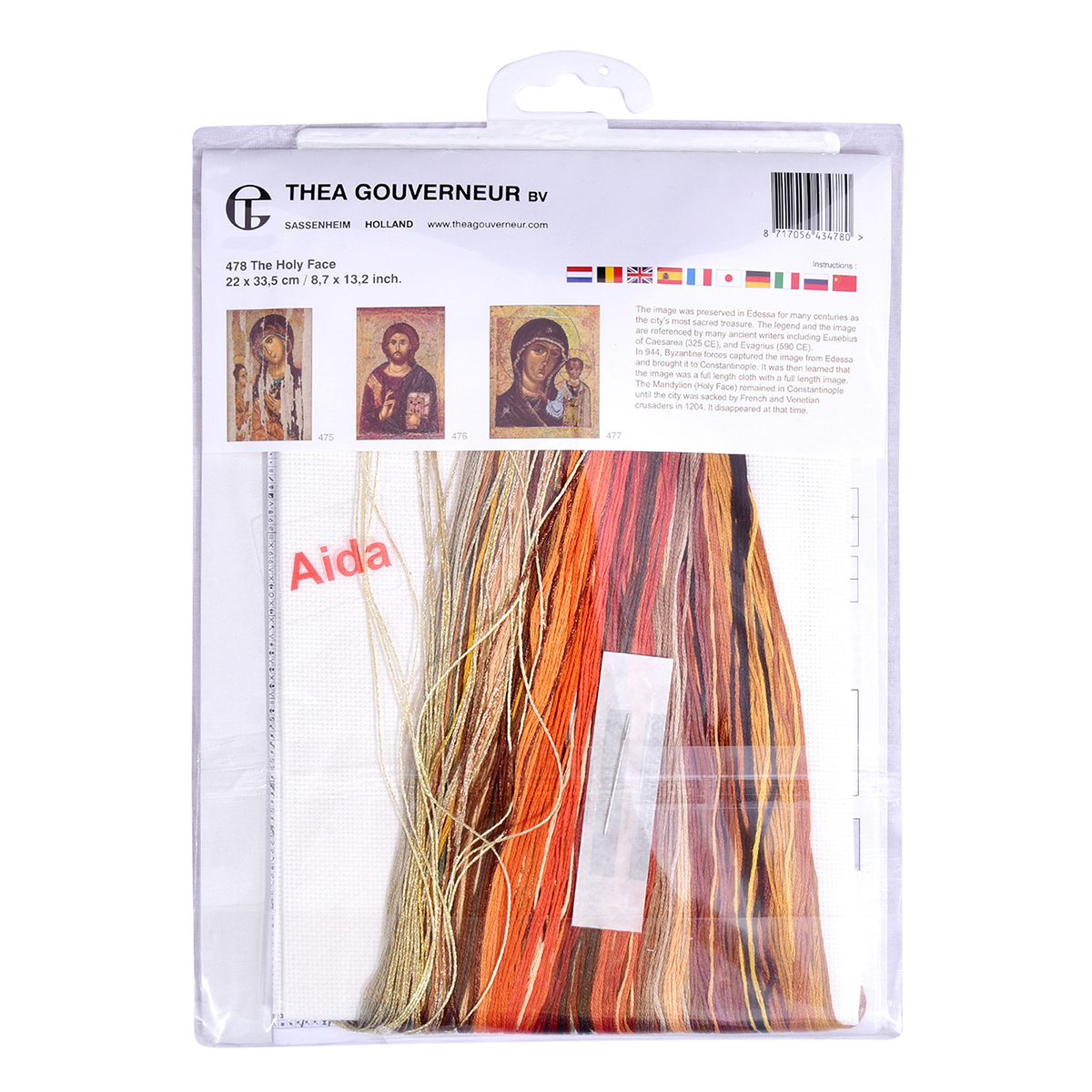 Наборы Thea Gouverneur укомплектованы качественными материалами, такими как мулине DMC из 100% хлопка и разные виды тканей для вышивания производства Zweigart. Наборы обозначенные буквой А после номера содержат в составе канву Aida, если в артикуле есть обозначение .05 – то этот набор укомплектован канвой Aida чёрного цвета. Также в ассортименте есть наборы на 100% льне и канве Jobelan. Черно-белые схемы тщательно прорабатываются вручную. Используется богатая цветовая палитра ниток, но в ассортименте компании есть и монохромные дизайны. Нитки разобраны по символам и закреплены на органайзере. Стрелка на бумажном органайзере указывает вверх, определяя правильность чтения символов.