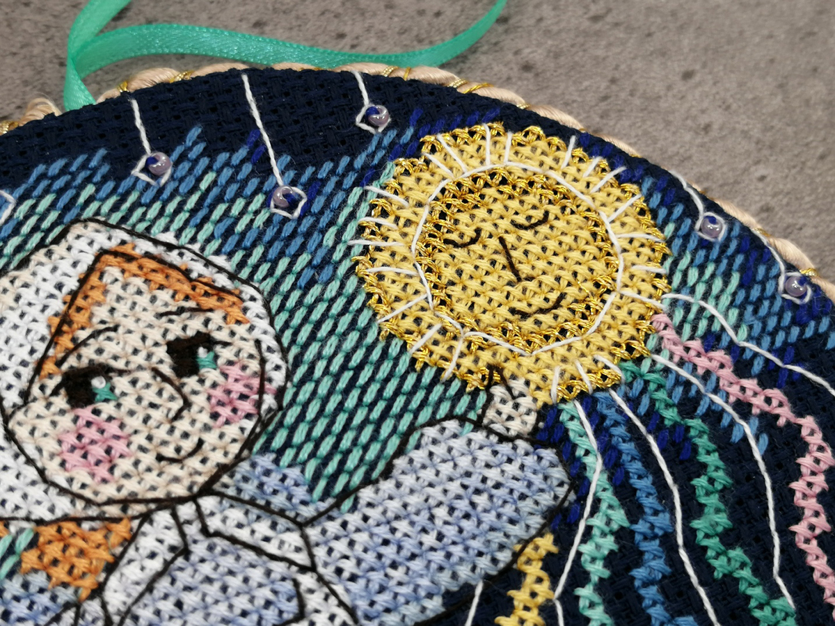 Канва Aida 14 ct темно-синяя, мулине Finca 17 цв., бисер, декоративный шнур, лента, игла, инструкция, схема черно-белая