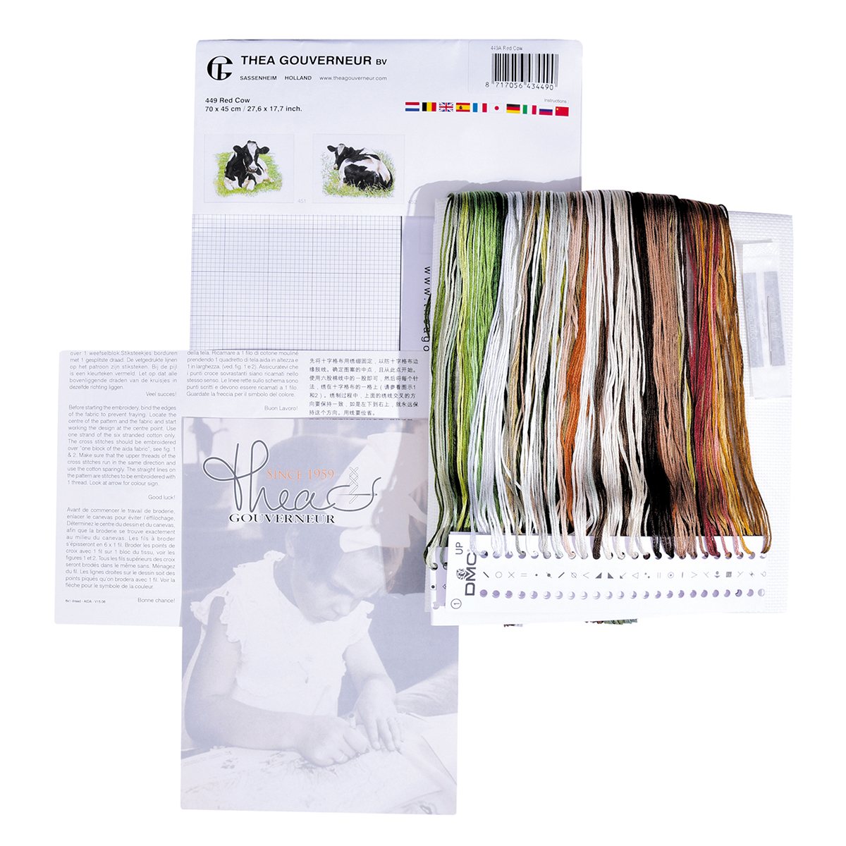 Наборы Thea Gouverneur укомплектованы качественными материалами, такими как мулине DMC из 100% хлопка и разные виды тканей для вышивания производства Zweigart. Наборы обозначенные буквой А после номера содержат в составе канву Aida, если в артикуле есть обозначение .05 – то этот набор укомплектован канвой Aida чёрного цвета. Также в ассортименте есть наборы на 100% льне и канве Jobelan. Черно-белые схемы тщательно прорабатываются вручную. Используется богатая цветовая палитра ниток, но в ассортименте компании есть и монохромные дизайны. Нитки разобраны по символам и закреплены на органайзере. Стрелка на бумажном органайзере указывает вверх, определяя правильность чтения символов.