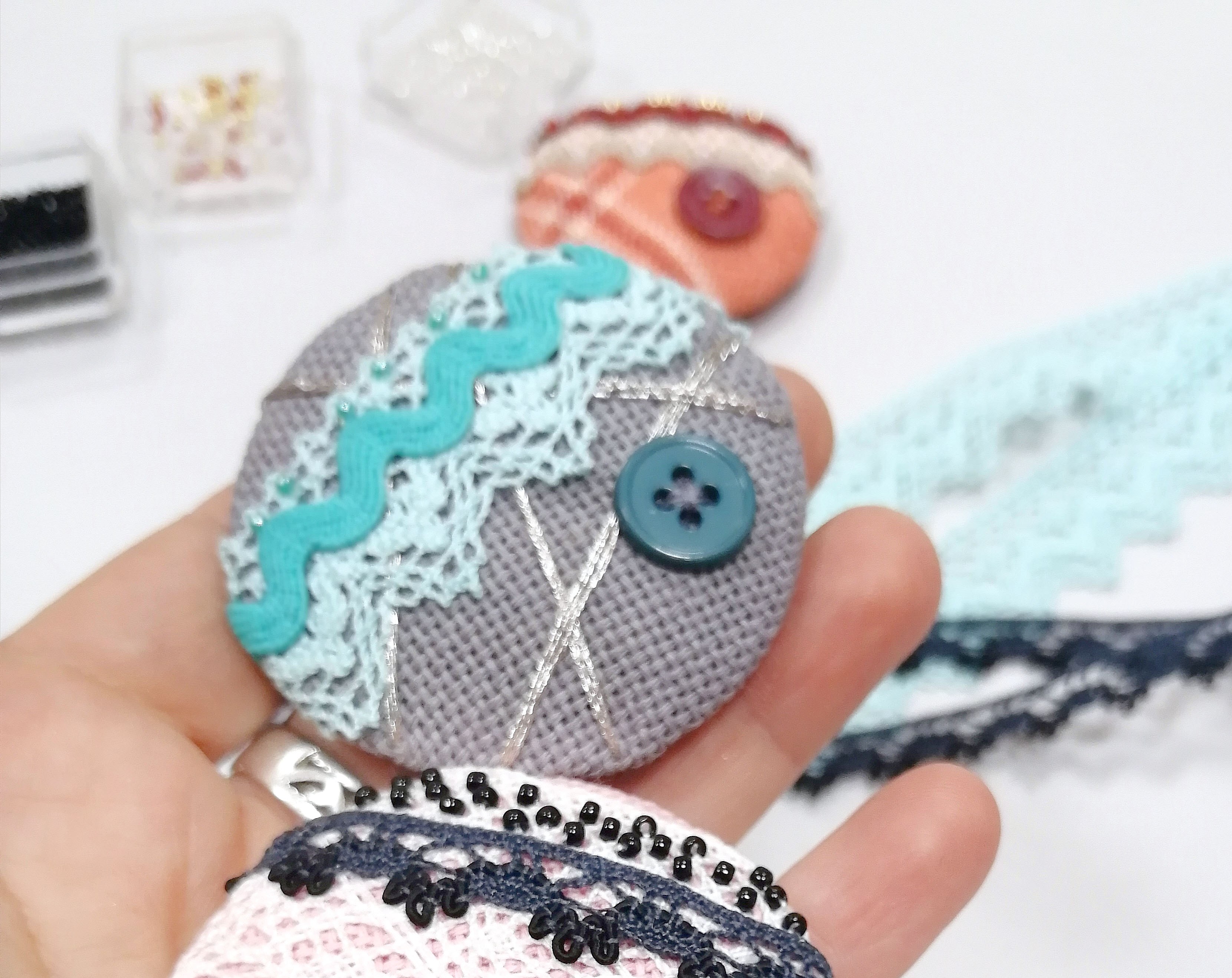 Ткань Zweigart, кружево Iemesa, тесьма, фетр Hemline, застежка Efco, нитки, пуговица, бисер, наполнитель, игла, подробная инструкция.