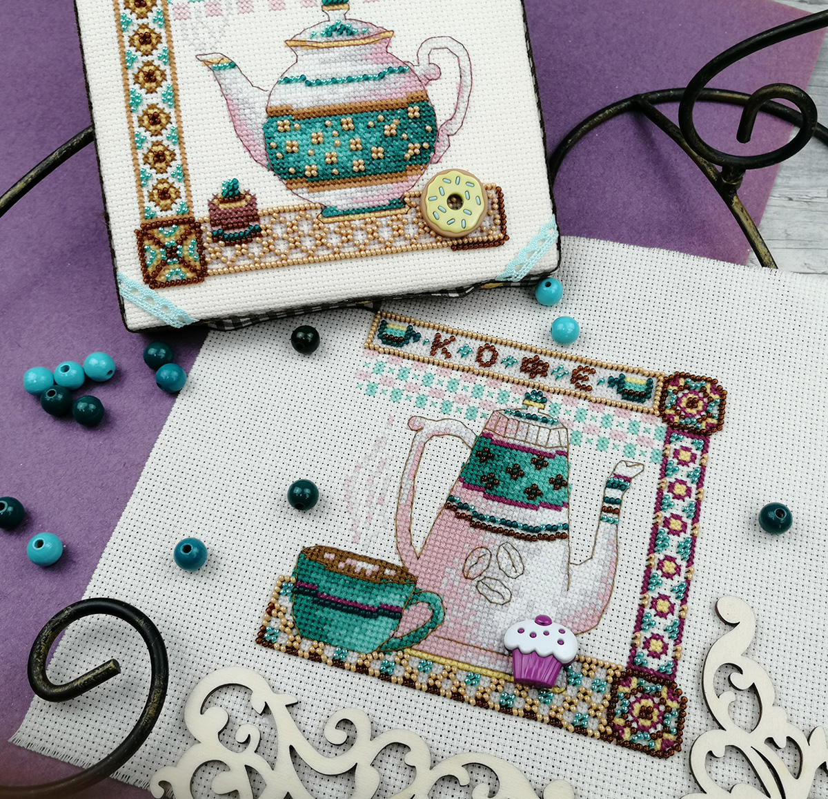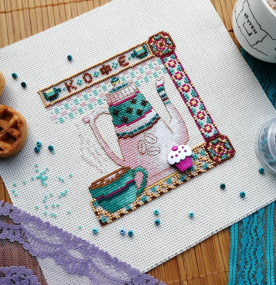 Кофе – одно слово и уже чувствуется аромат этого напитка. Чашечка кофе с пожеланиями доброго утра и хорошего дня. Пусть эта небольшая вышивка с кофейником добавит в вашу кухню очарования.