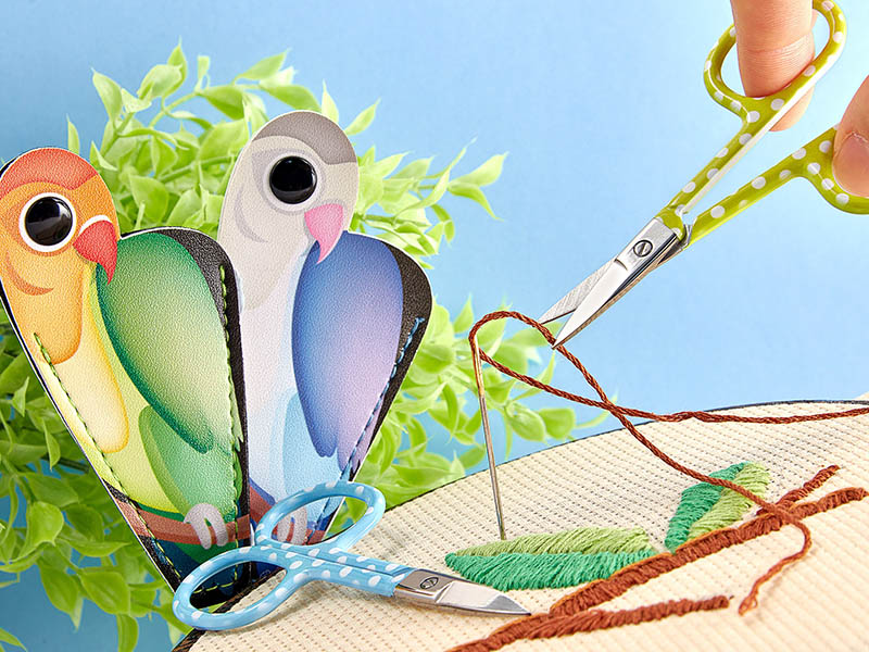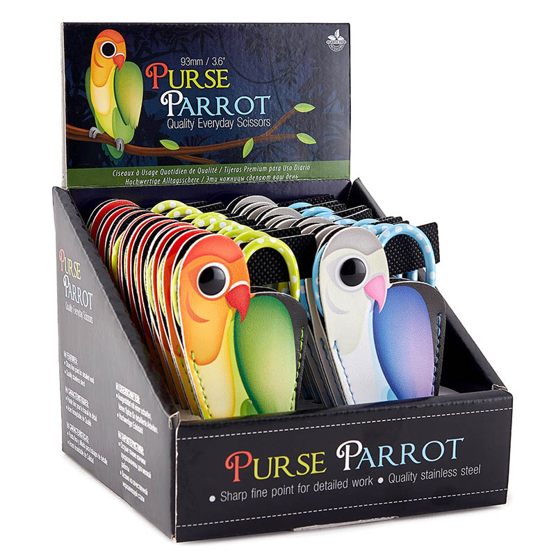 Ножницы для вышивания в чехольчике, 20 шт. в картонном прикассовом стенде. Острая и тонкая заточка лезвий для детальной работы. Лезвия из нержавеющей стали идеально подходят для резки нитей, мулине и т.д. Храните ножницы в чехле для шитья из искусственной кожи в виде прекрасного попугая. Закрепите ножницы защелкой-кнопкой “попугайный глаз”. Идеальный компаньон для сумочки каждой дамы. Штрих-код, отпечатанный на чехле из полиуретана (можно обрезать после покупки). Цвета ножниц: синий в белый горошек, лаймовый в белый горошек. Размер ножниц: 93 мм. Размеры стенда (закрытый): W12.5 x D13.5 x H11 см. Размеры стенда (в собранном виде): W12.5 x D13.5 x H17 см. Вес брутто стенда: 575 г.