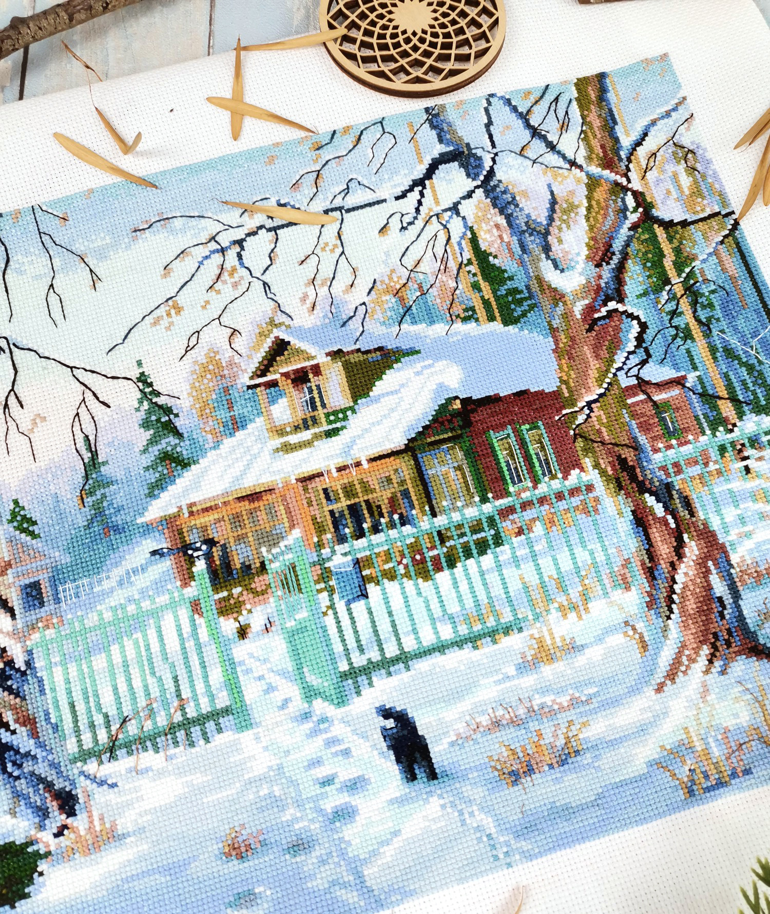 Атмосферный дизайн, который понравится ценителям красоты родного края и зимних пейзажей. Бревенчатый дом с яркими наличниками на окнах и залитой солнцем террасой словно укутан большими, отливающими синевой сугробами снега, накиданными последними февральскими снегопадами. Дорожка припорошена метелью, но по тому, как ярко пригревает солнце, и блестят сосульки на крыше, чувствуется неодолимое приближение весны.