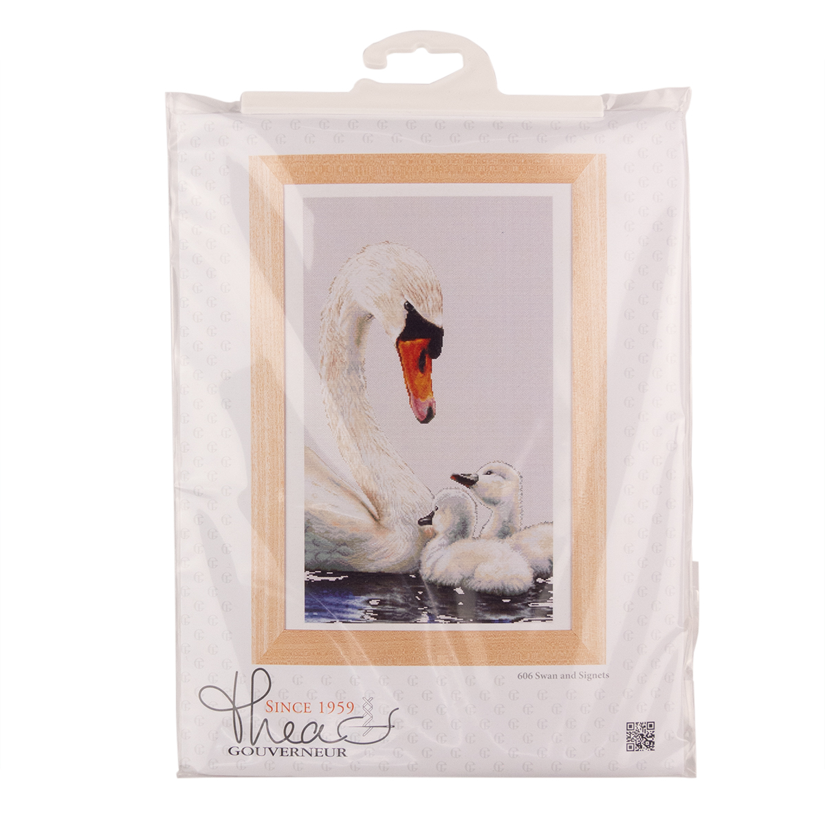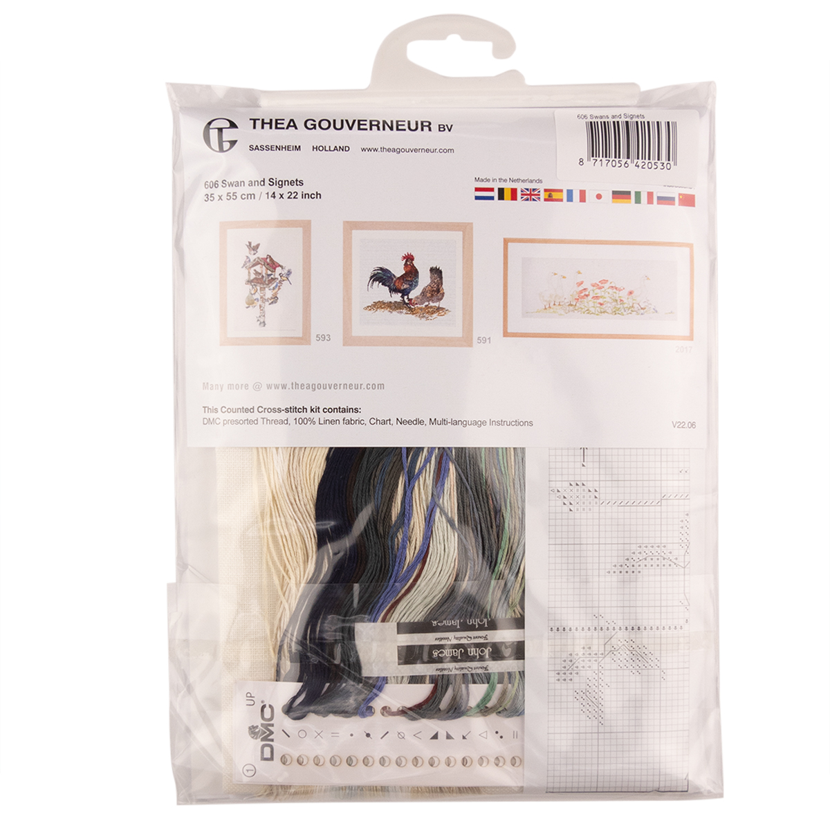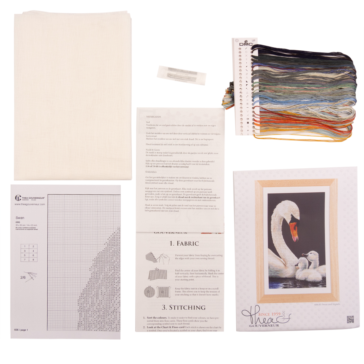 Наборы Thea Gouverneur укомплектованы качественными материалами, такими как мулине DMC из 100% хлопка и разные виды тканей для вышивания производства Zweigart. Наборы обозначенные буквой А после номера содержат в составе канву Aida, если в артикуле есть обозначение .05 – то этот набор укомплектован канвой Aida чёрного цвета. Также в ассортименте есть наборы на 100% льне и канве Jobelan. Черно-белые схемы тщательно прорабатываются вручную. Используется богатая цветовая палитра ниток, но в ассортименте компании есть и монохромные дизайны. Нитки разобраны по символам и закреплены на органайзере. Стрелка на бумажном органайзере указывает вверх, определяя правильность чтения символов.