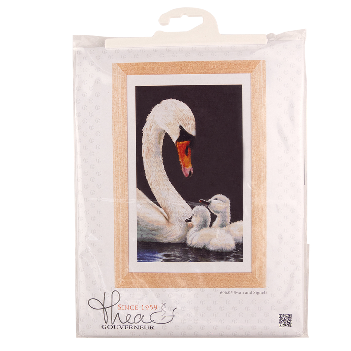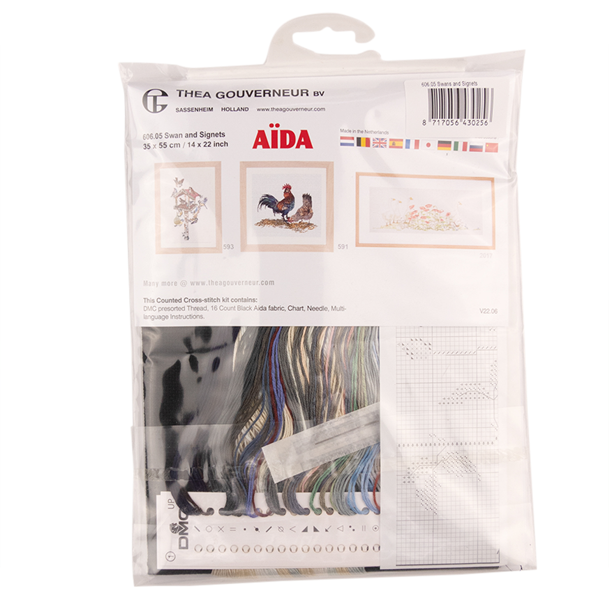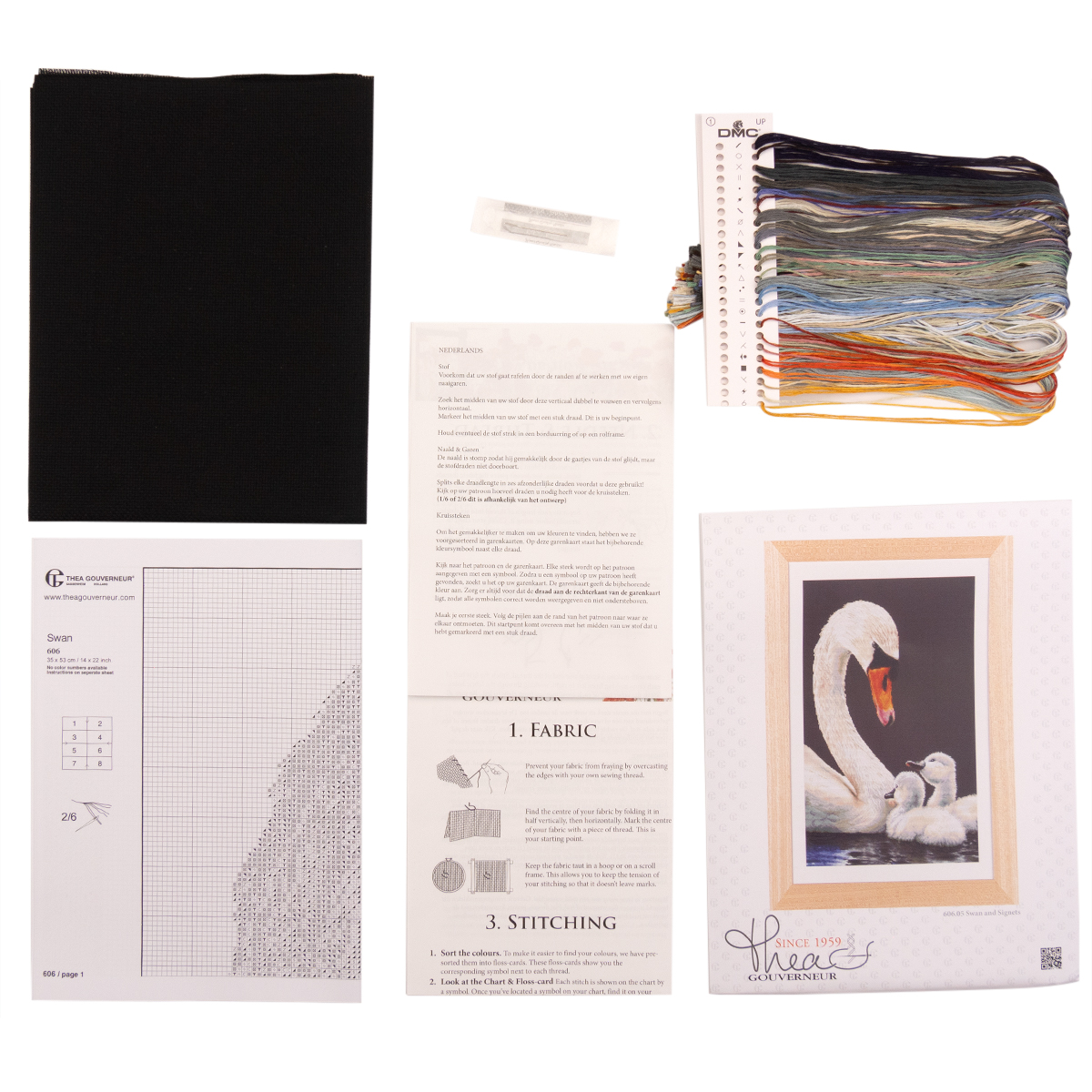 Наборы Thea Gouverneur укомплектованы качественными материалами, такими как мулине DMC из 100% хлопка и разные виды тканей для вышивания производства Zweigart. Наборы обозначенные буквой А после номера содержат в составе канву Aida, если в артикуле есть обозначение .05 – то этот набор укомплектован канвой Aida чёрного цвета. Также в ассортименте есть наборы на 100% льне и канве Jobelan. Черно-белые схемы тщательно прорабатываются вручную. Используется богатая цветовая палитра ниток, но в ассортименте компании есть и монохромные дизайны. Нитки разобраны по символам и закреплены на органайзере. Стрелка на бумажном органайзере указывает вверх, определяя правильность чтения символов.